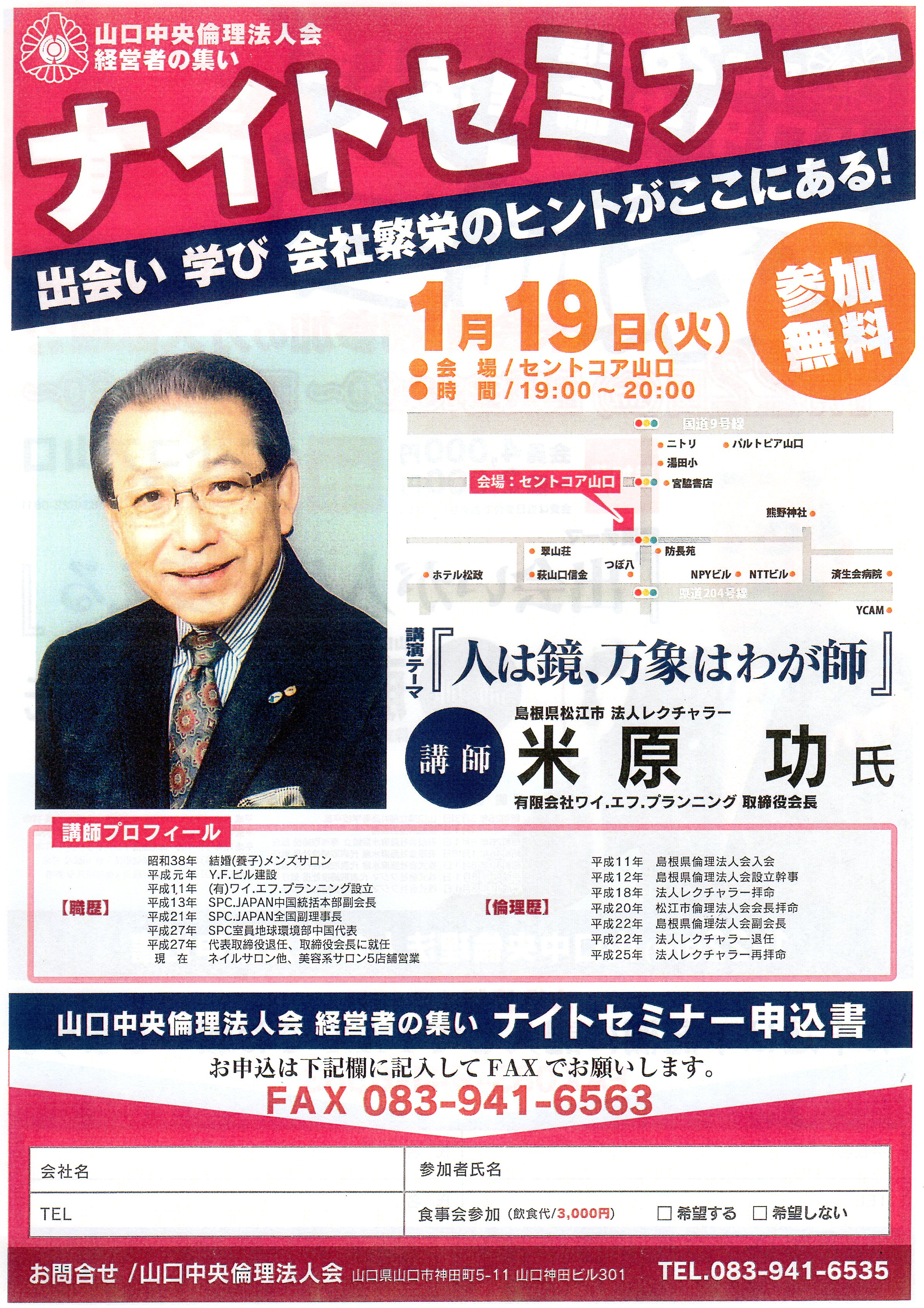 【倫理経営基礎講座】講師:一般社団法人倫理研究所 参与 新原 隆一 氏 テーマ:「第8講 明朗の実践」 会場 セントコア山口