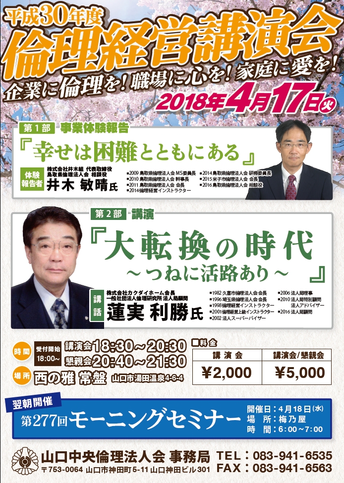 この度2018年4月17日(火)に山口中央倫理法人会 倫理経営講演会を開催いたします。