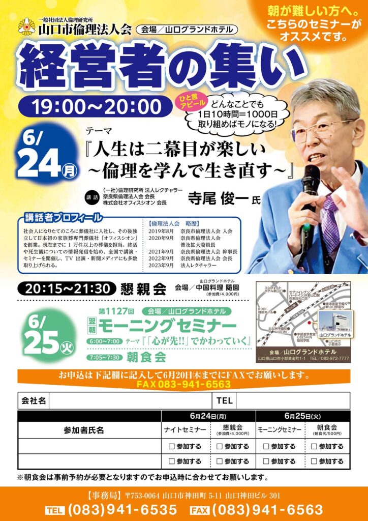 2024年6月24日(月) 【経営者の集い】一般社団法人倫理研究所 法人レクチャラー 奈良県倫理法人会 会長 寺尾 俊一 氏 テーマ:「 人生は二幕目が楽しい~倫理を学んで生き直す~」