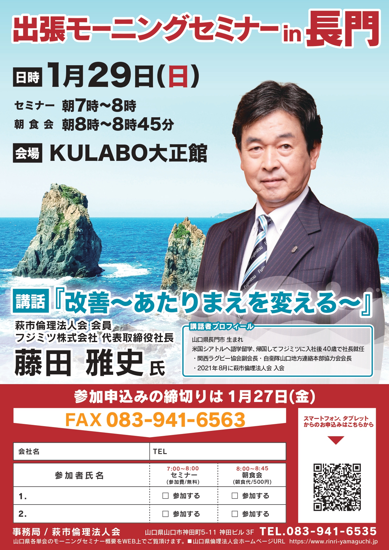 | 講師 | 萩市倫理法人会 会員 / フジミツ(株) 代表取締役社長 藤田 雅史氏 |