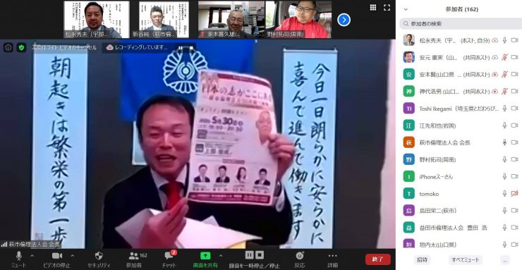 前日5/30に萩市倫理法人会オンライン特別セミナーがあった後に、通常のオンラインモーニングセミナー。オンライン特別セミナーの運営に関わってくれた方は疲労が大きく、当日のモーニングセミナーはどうなる事かと思いましたが、無事に終わらせる事が出来たのは金子会長のリーダーシップだろうと感じました。