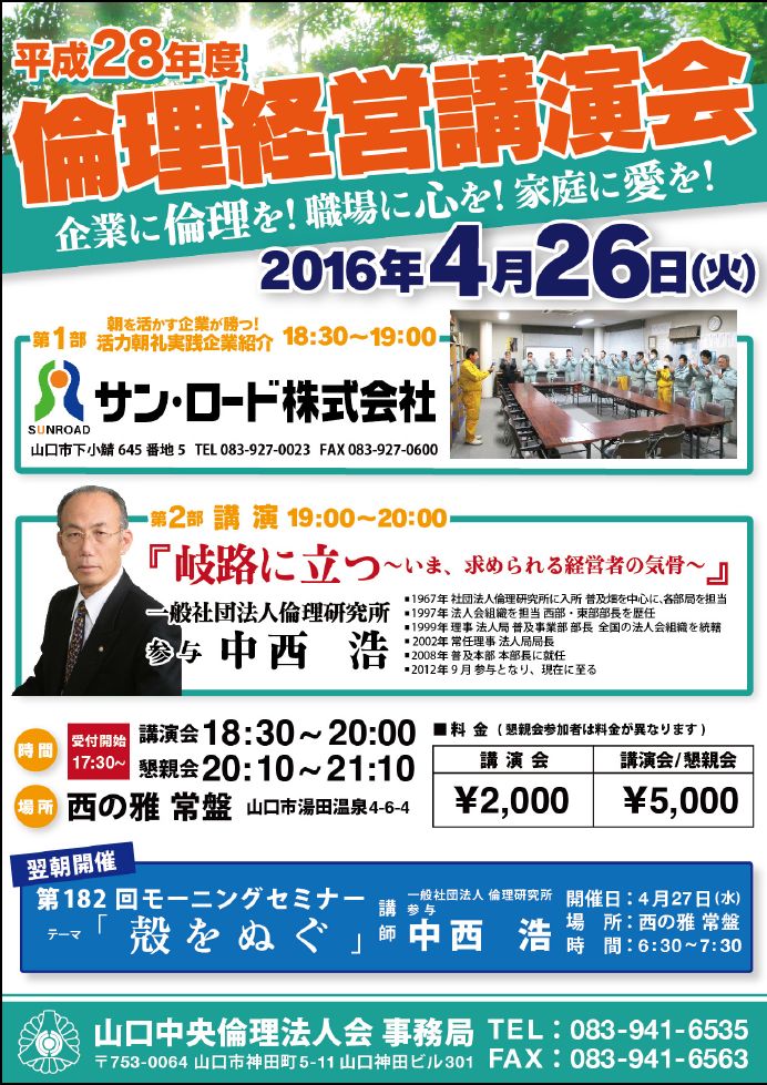 ご多忙の中とは存じますが、恒例となっております『平成28年度倫理経営講演会』を本年も開催することとなりました。