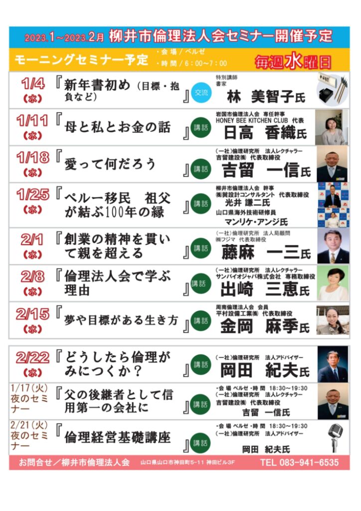 柳井市倫理法人会 1月・2月 経営者モーニングセミナー 予定表