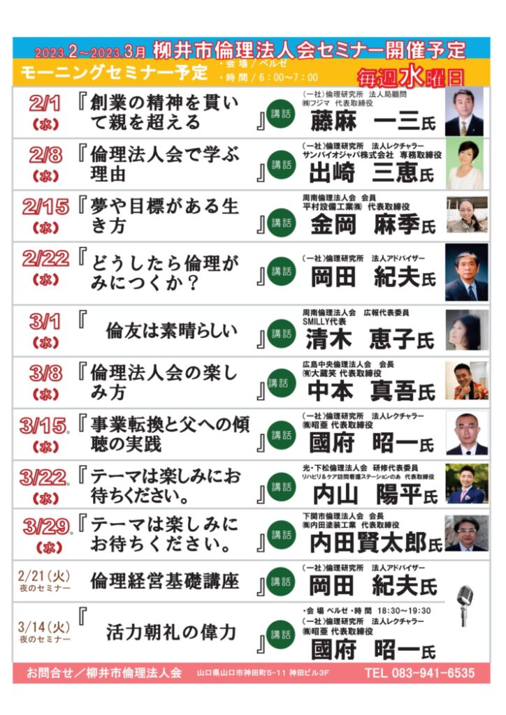 柳井市倫理法人会 2月・3月 経営者モーニングセミナー予定表