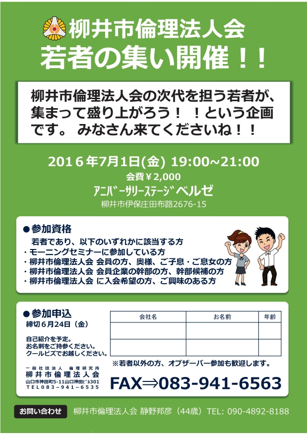 今後は、今までの活動や前例に捕らわれず、若者らしい新しい発想で楽しく活動していくことが決まりました。また、若者の集いの愛称を「柳倫塾(りゅうりんじゅく)」とし、お互いに良い刺激を感じながら切磋琢磨し、自己の研鑽に励んでいこうと盛り上がりました。