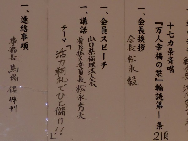 | 朝食 | 朝食をご希望の方は事務局までお申し出ください。※朝食代金は別途必要です。 ※現在、コロナ禍のため地域によって朝食会を中止する場合がございます。お申し込みの際には、各単位法人会から送付しております「経営者モーニングセミナーのご案内」をご確認いただくか、山口県倫理法人会事務局へご確認ください。 |