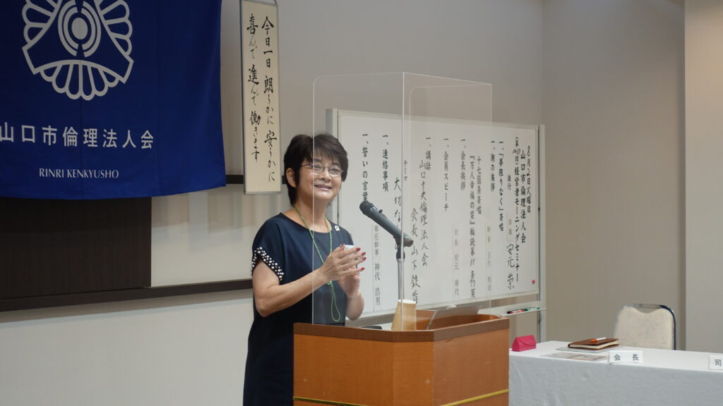 講話:山下 鉄旨 会長:星の王子様(アントワーヌ・ド・サン=テグジュペリ)の本の内容と倫理との接点を分かり易く、「大切なもの」と題してお話しいただきました。途中、星の王子様をあらすじを聞きながら読んでいるような気持ちになりましたが、登場人物のキツネが教えてくれた秘密。王様の気づき!など、物事はこころで見なくてはよく見えない。一番大切なことは目には見えない。相手のことを思って費やした時間は特別なものになるなど、倫理の学びと合うところが多いと感じました。「この本から学ぶ=倫理の実践」。人との絆、感謝の心を持ち続けて理想の自分に近づくように・・・。あっという間の40分でした。