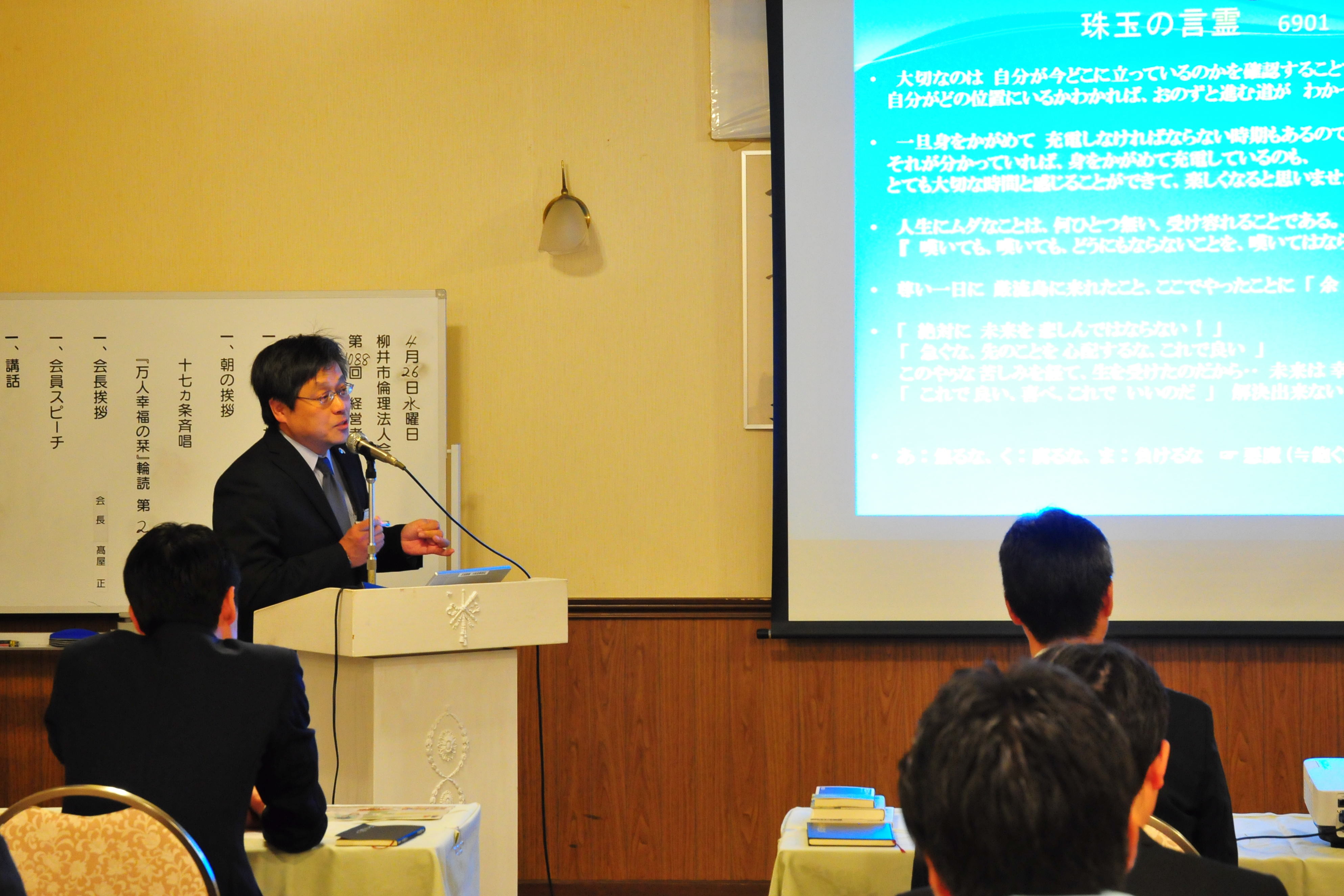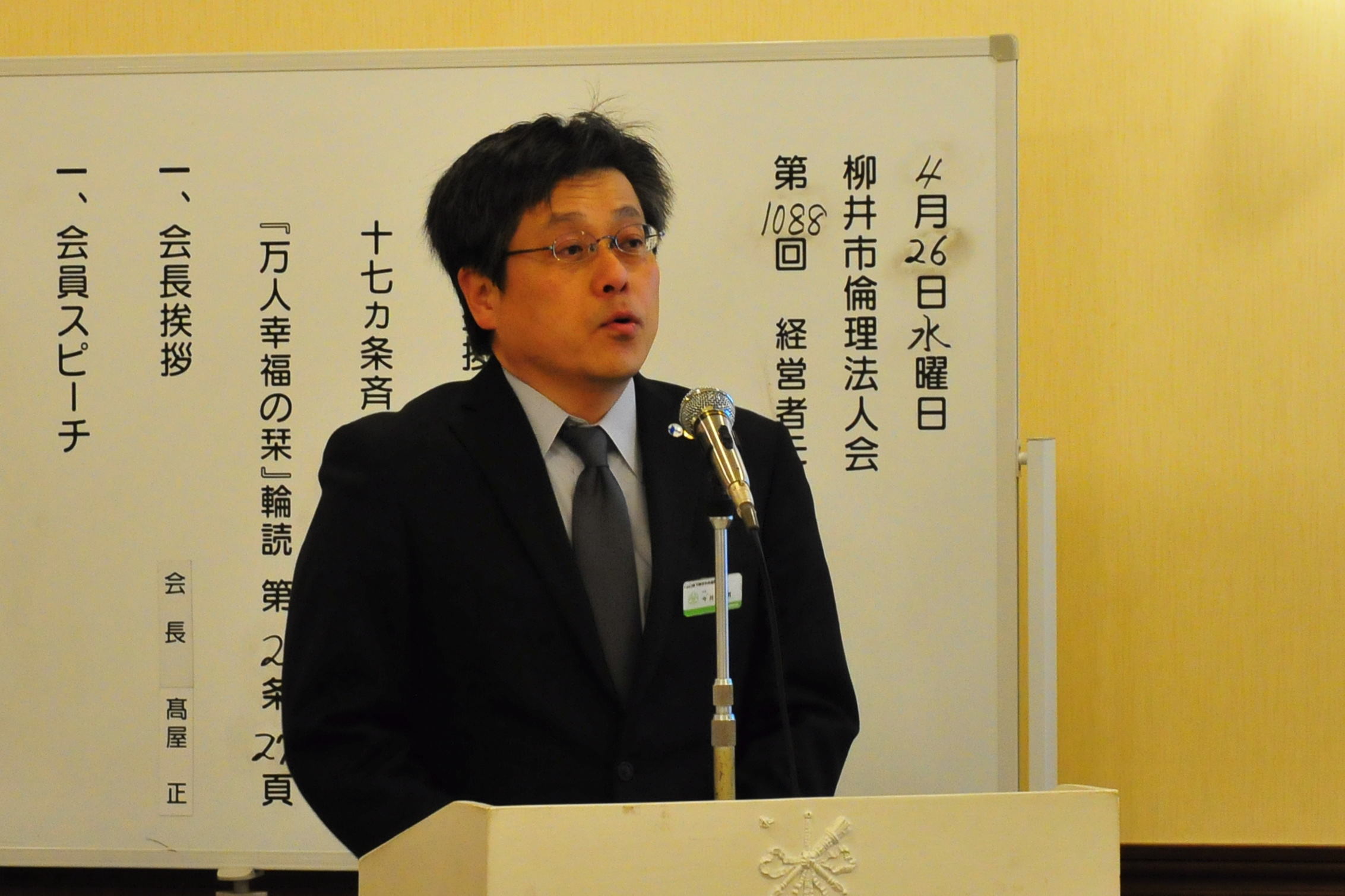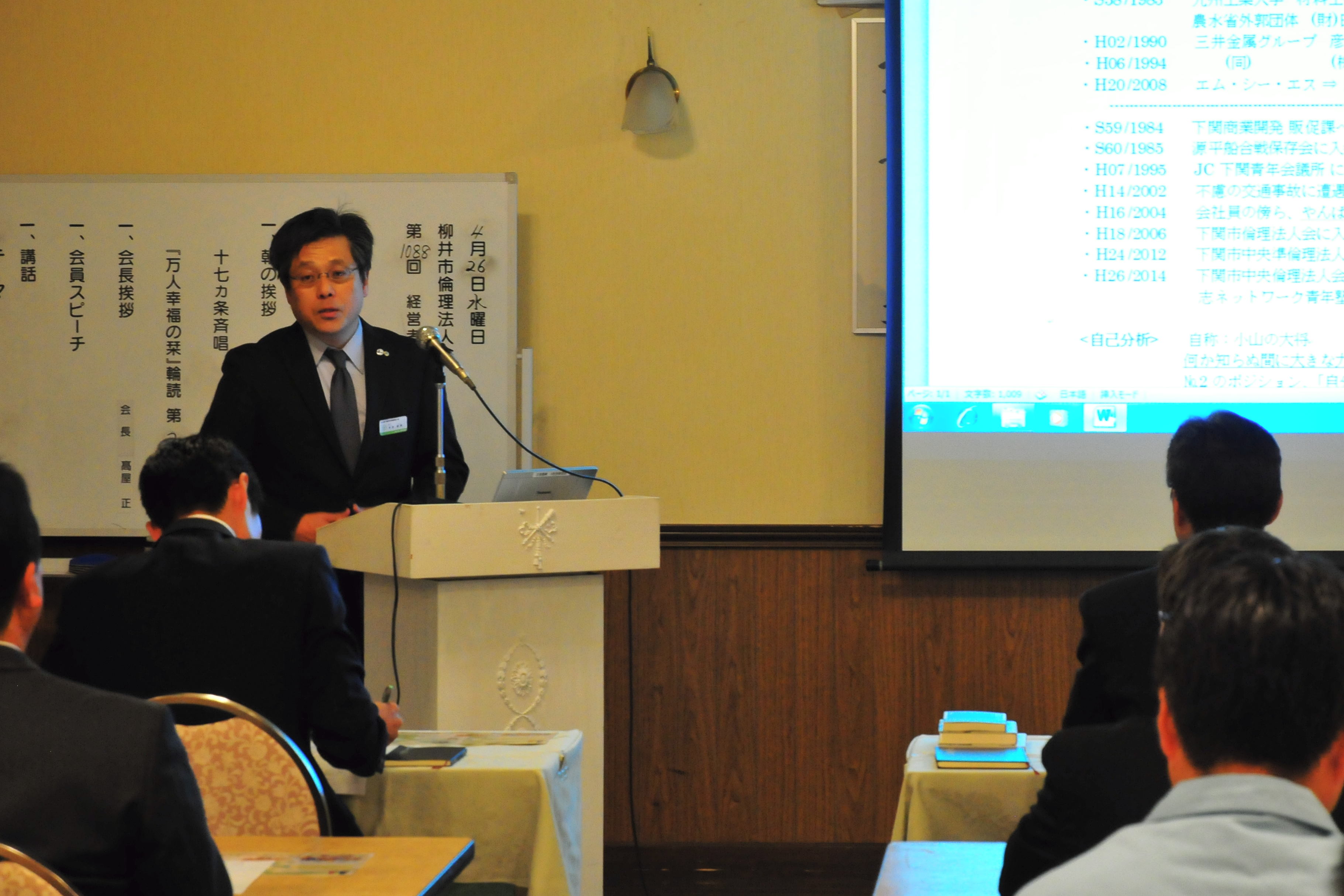 4月26日に行われた第1088回柳井市倫理法人会経営者モーニングセミナーは「わたしの志」と題して、下関中央倫理法人会 会長 今井 泉男 氏(やんばる弘房有限会社 代表取締役)の講話を聴きました。