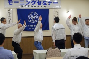 本日夜開催される、目標達成報告会にて行われる『模擬朝礼コンテスト』に出場するメンバーの発表がありました。前日2時間の練習の割には息がぴったりの6名、さて山口県の倫理法人会10単会のうち何位になりますか?、期待しましょう。(追記 結果・・・準優勝!! よく頑張りました。お疲れさまでした。)