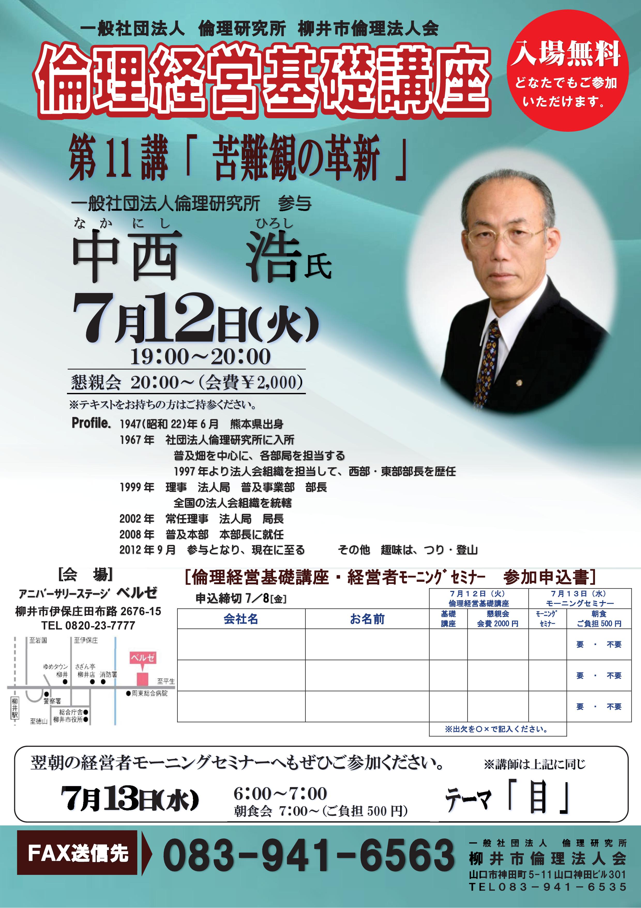 7月12日(火)に開催された倫理経営基礎講座は、一般社団法人倫理研究所 中西 浩 参与を講師に迎え、倫理経営基礎講座テキスト第11項「苦難観の革新」 を学びました。