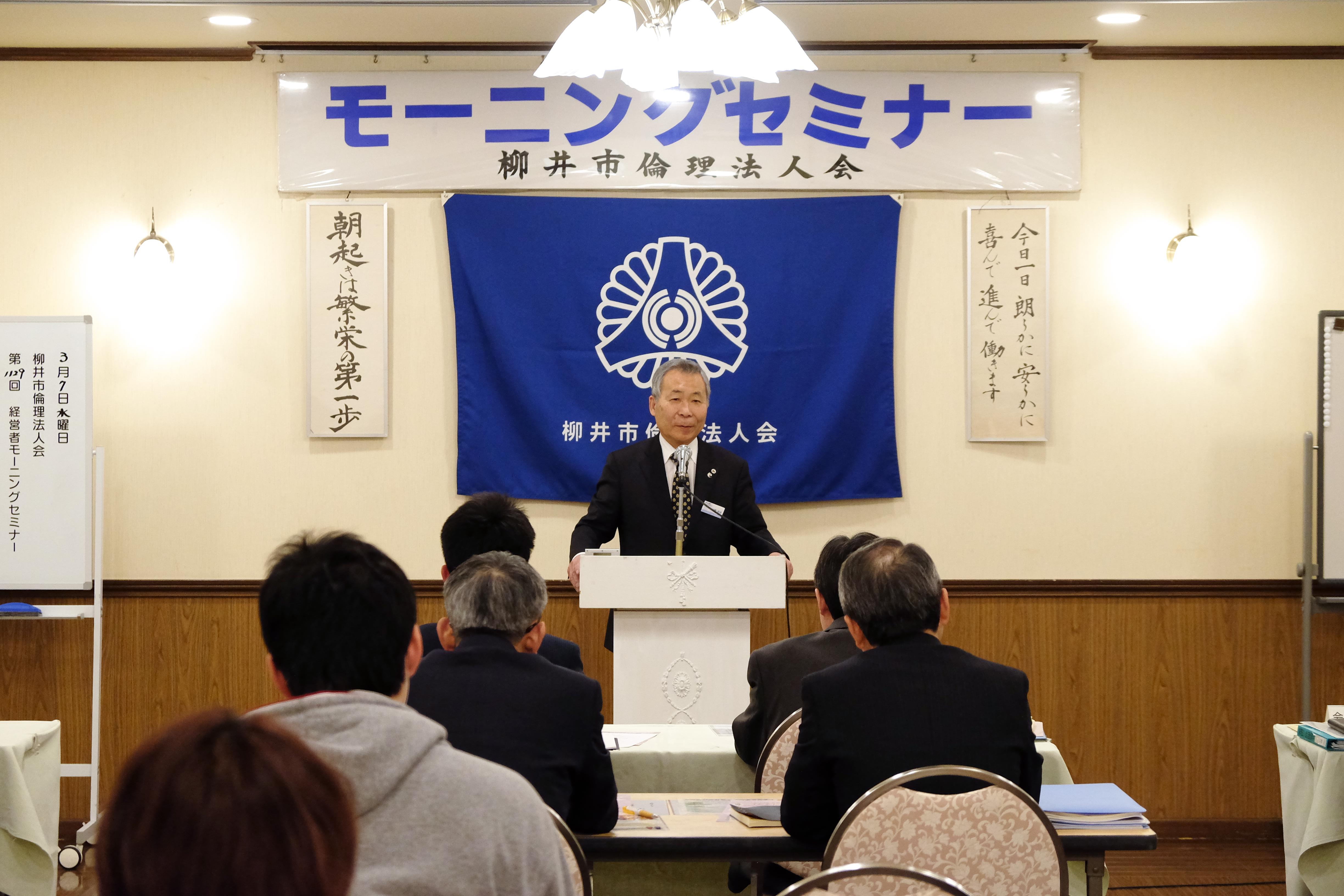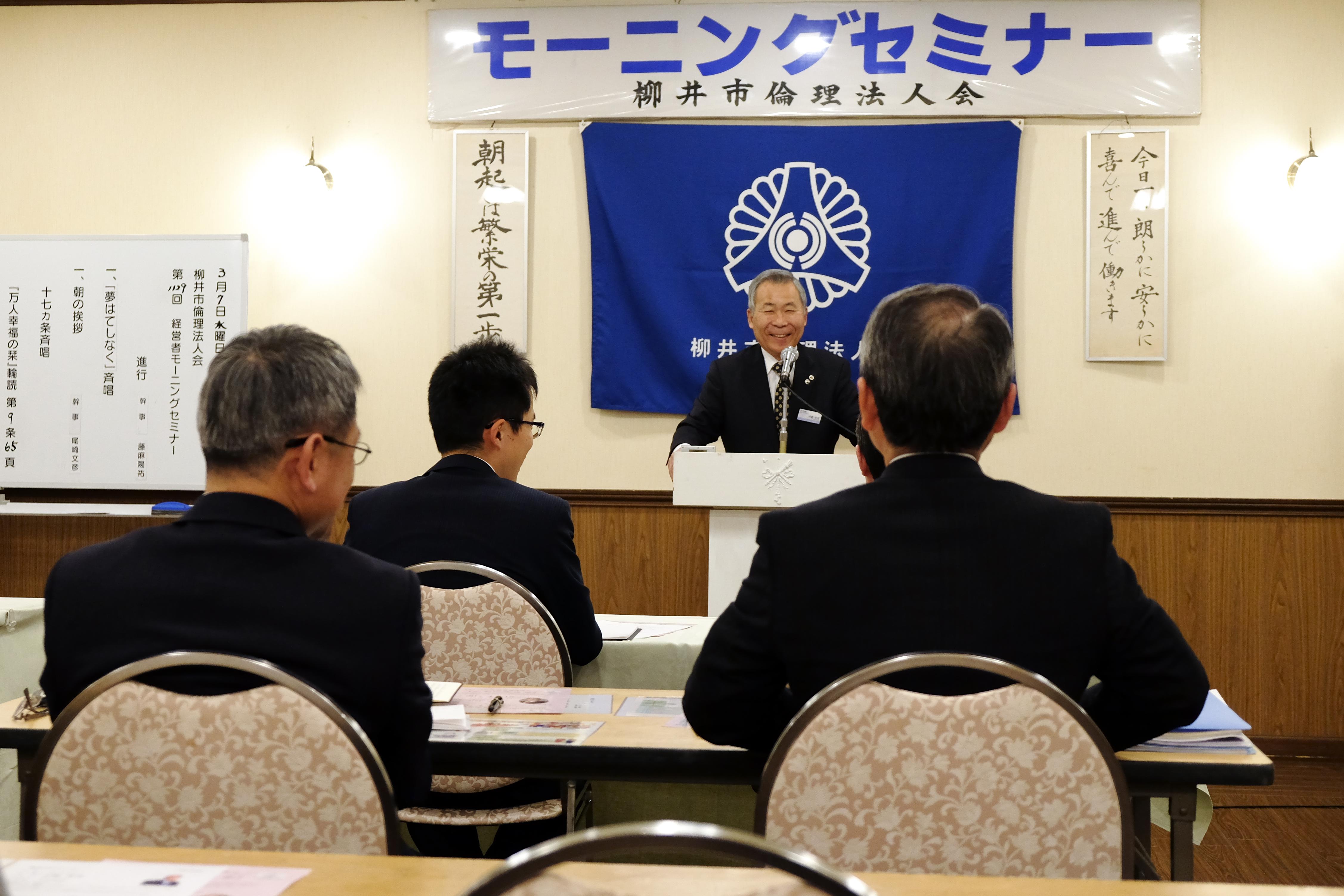 3月7日に行われた第1129回柳井市倫理法人会経営者モーニングセミナーは、「足下の実践」と題して(一社)倫理研究所 法人アドバイザー 山路 卓司 氏((株)河幸海苔店 会長)の講話を聴きました。