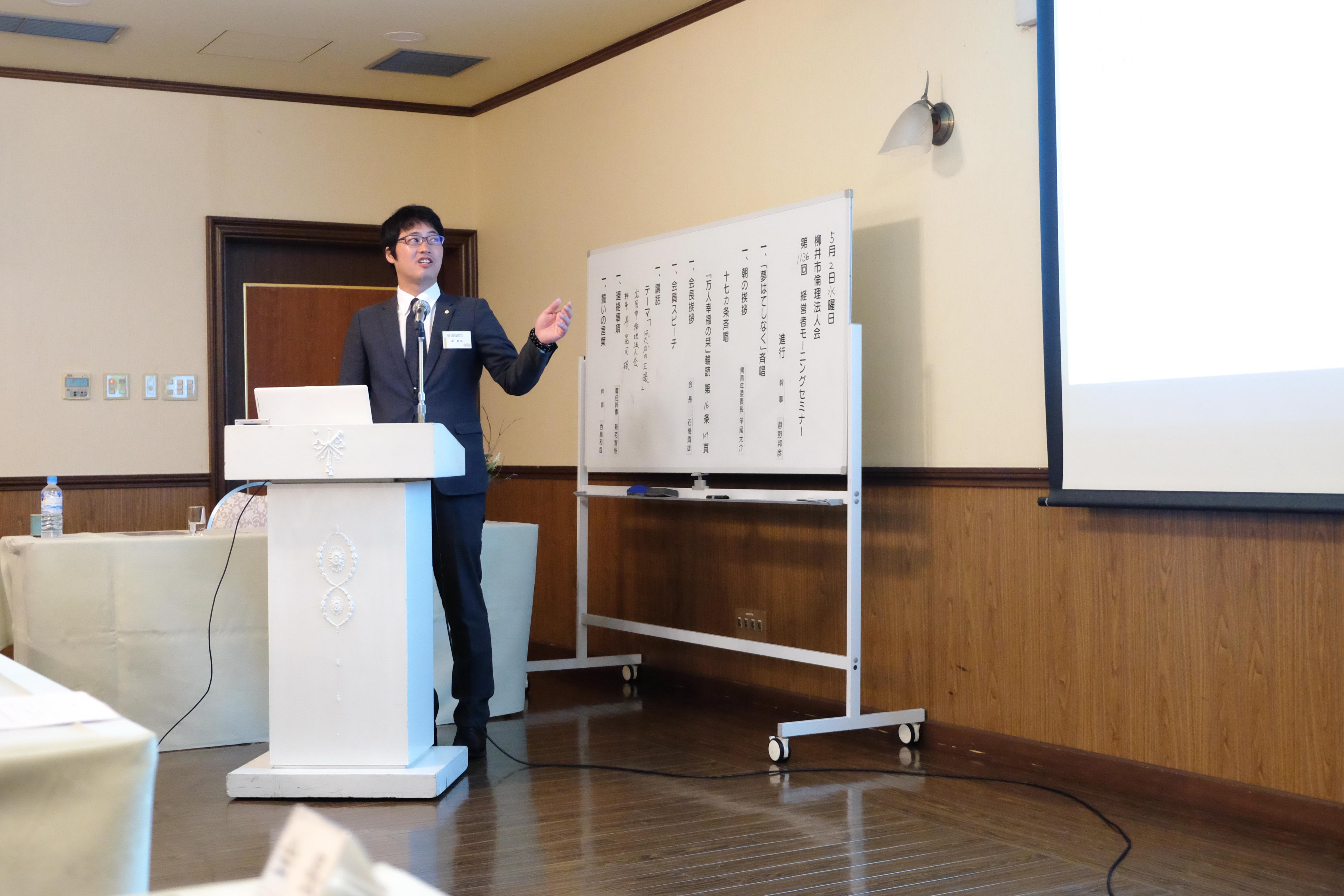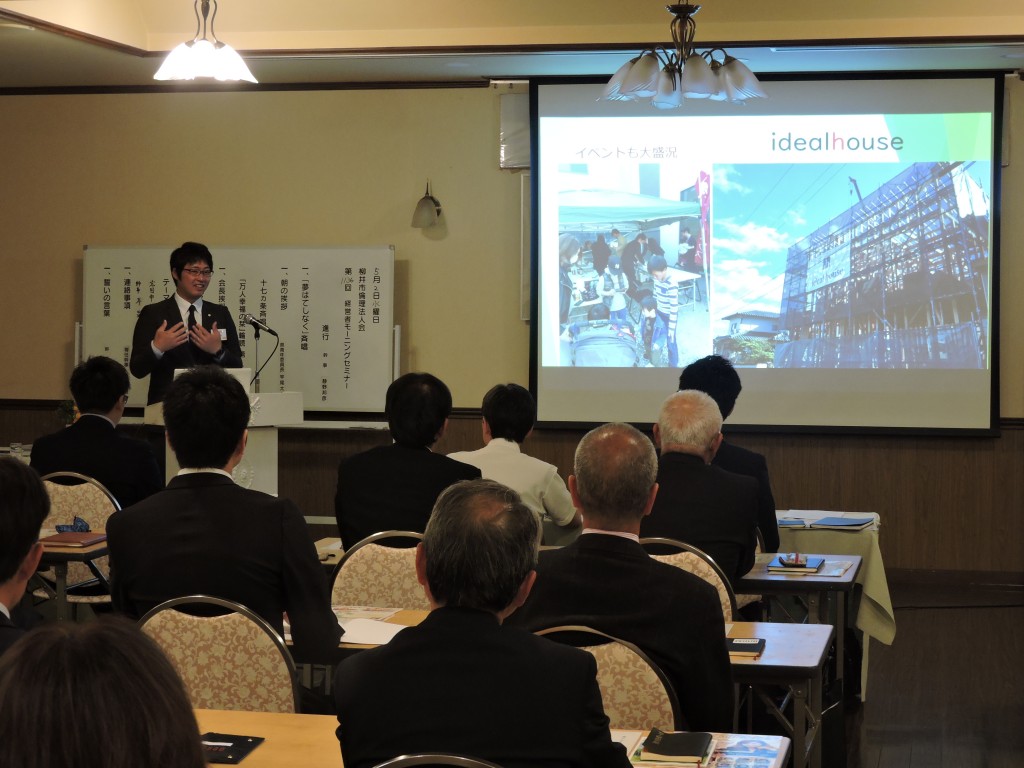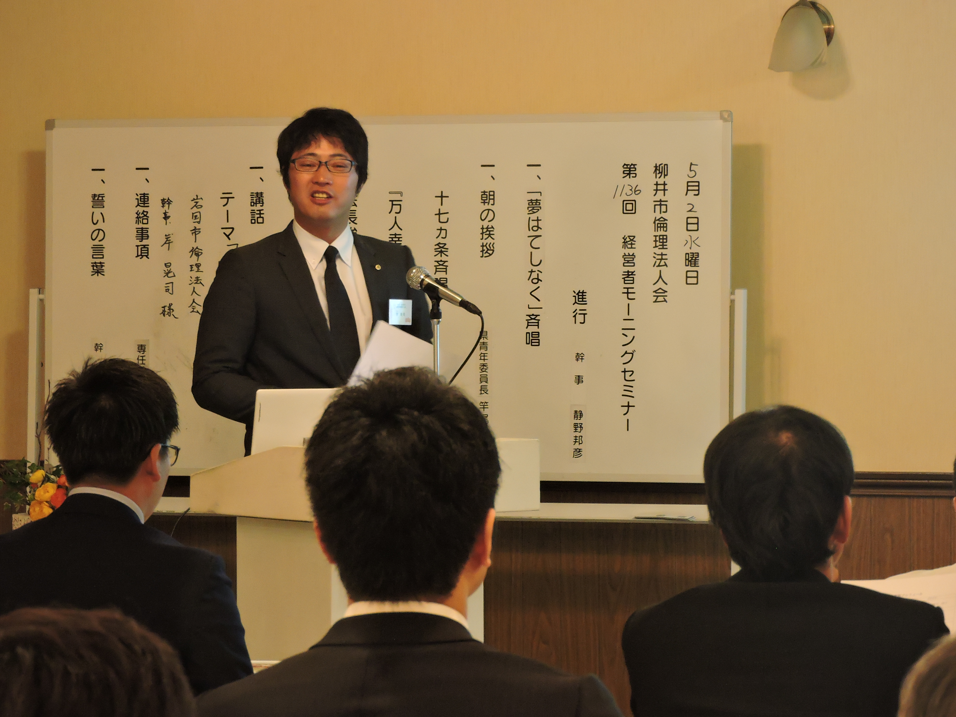 日頃、住宅関連の会社を兄弟で営む岸 幹事、今回は20代の頃ガソリンスタンド店長としての日々と大きな失敗の経験をお話しいただきました。店舗成績を向上させるために良かれと思い行っていたことが、始めは好転していたが、だんだんと歪がうまれ崩れていった過去。その中で学んだ 、感謝という心。倫理法人会に入会して、万人幸福の栞に出会い、まるで母親の想いが本になったようなものだと感じたこと。倫理でいろいろな仲間が増え、家族からも、倫理に入ってよかったといわれているとのこと。これからも倫理を学び、家庭に仕事に人生に生かし、母親から頂いた倫理の想いを新たな人々にも伝えていきたいとお話しいただきました。倫理を学ぶ素晴らしさを改めて気づかせていただき、勇気と元気がでるモーニングセミナーでした。