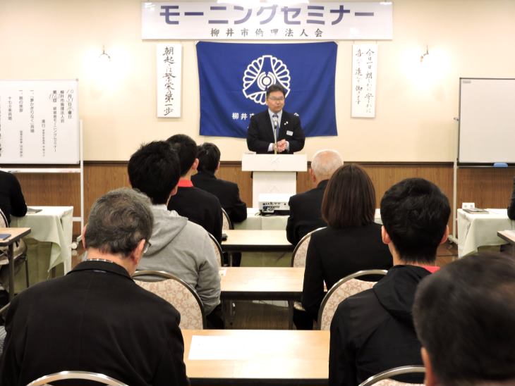 今回のモーニングセミナーは、平成31年度山口県倫理法人会会長に就任された、岩国市倫理法人会から安本 賢さん(安本建設株式会社 代表取締役 社長)をお招きして、「さらなる“新”に挑む」と題してお話を伺いました。戦後の復興への願いを込めて創業されて70年目の同社のこれまでの取り組みやこれからのビジョン、また会長としての山口県倫理法人会のこれからの想いをを熱く語っていただきました。