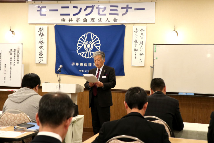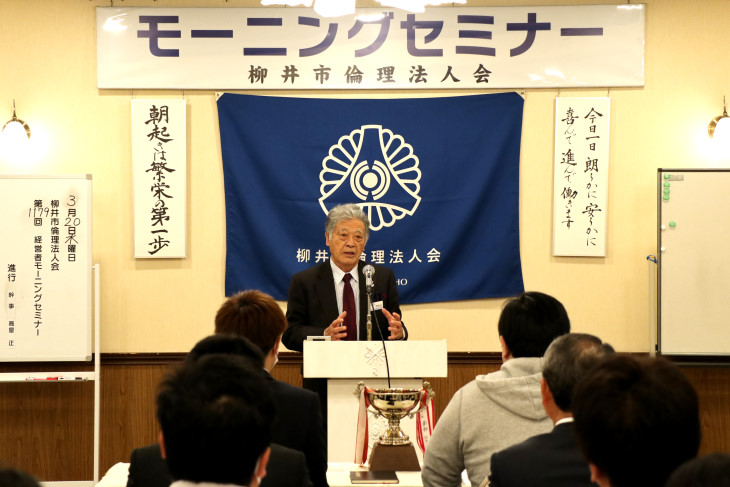 3月20日、第1179回柳井市倫理法人会経営者モーニングセミナーは(一社)倫理研究所 参事 法人アドバイザー 秀倫塾 塾長 飯塚 秀夫 氏をお迎えして「凡事徹底 ~小さなことに磨きをかける~」と題してお話をいただきました。
