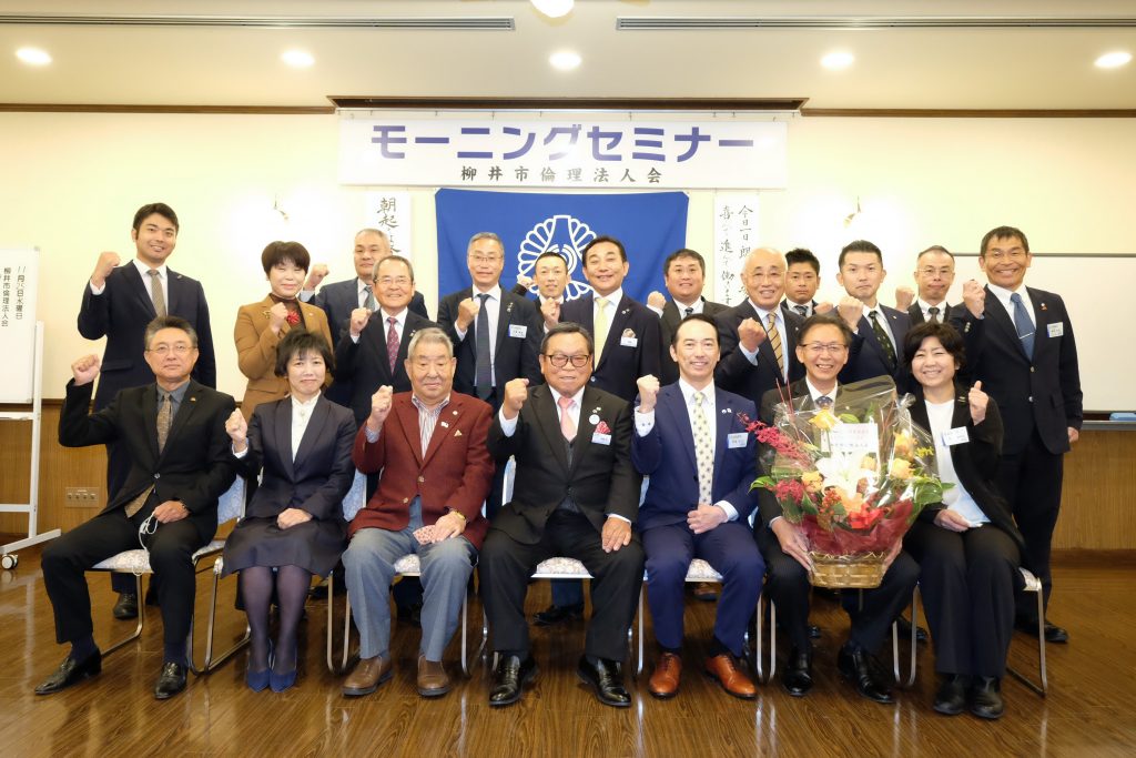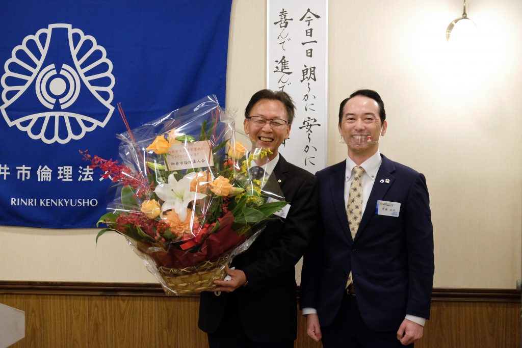 柳井市倫理法人会 会員 「創作舞踊 菅源流」様が、柳井市文化功労章を受章され、事務局の菅源 右光 MS委員長に花束が贈られました。「長年の活動が認められ、とても嬉しい」と喜びの発表がありました。