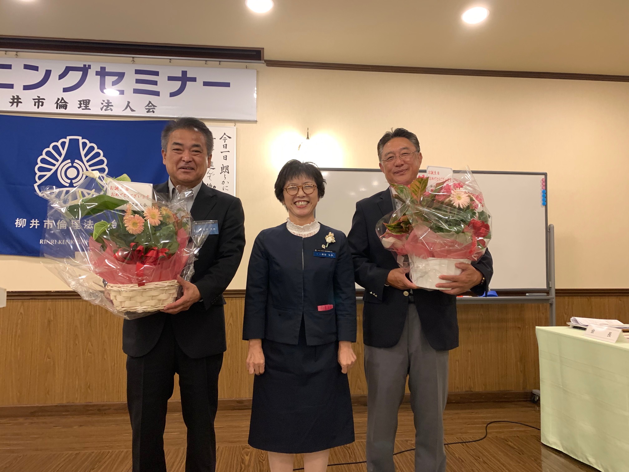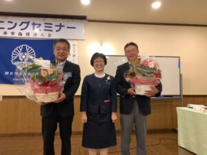 誕生日のお花を頂いた延河副会長、光井幹事 会員スピーチ 延河副会長