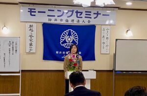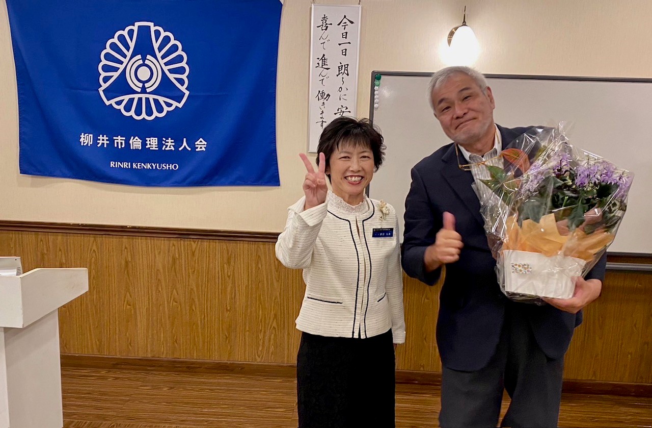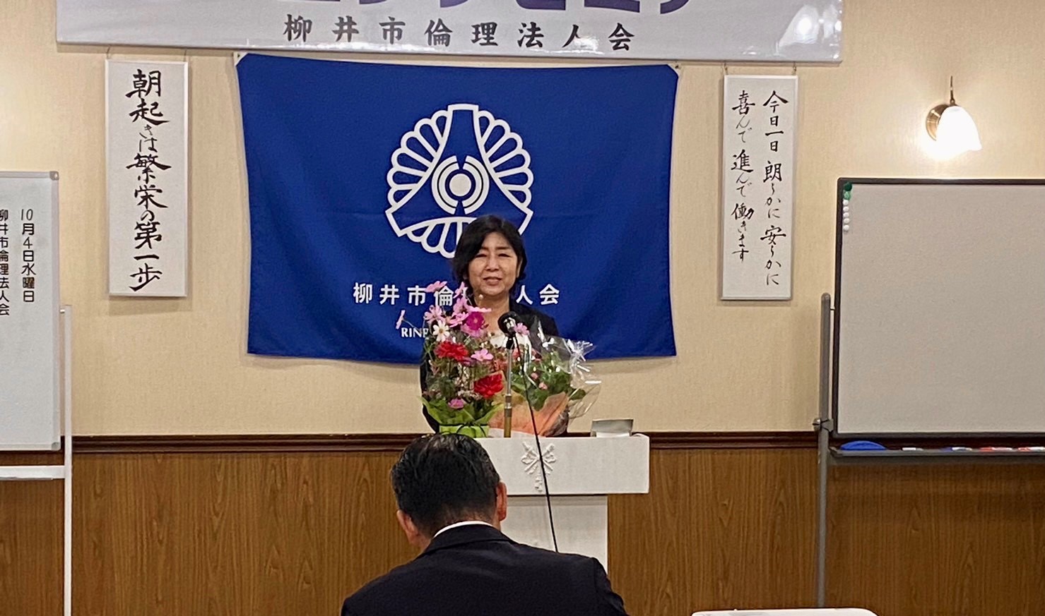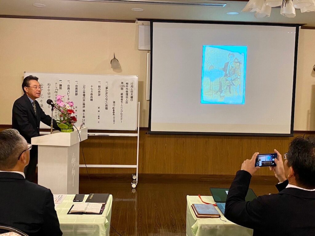 廣田会長の挨拶では10月お誕生日を迎えられる会員様12名の紹介とモーニングセミナーに参加されていた尾崎専任幹事と末永幹事に誕生日のお花が贈呈されました。
