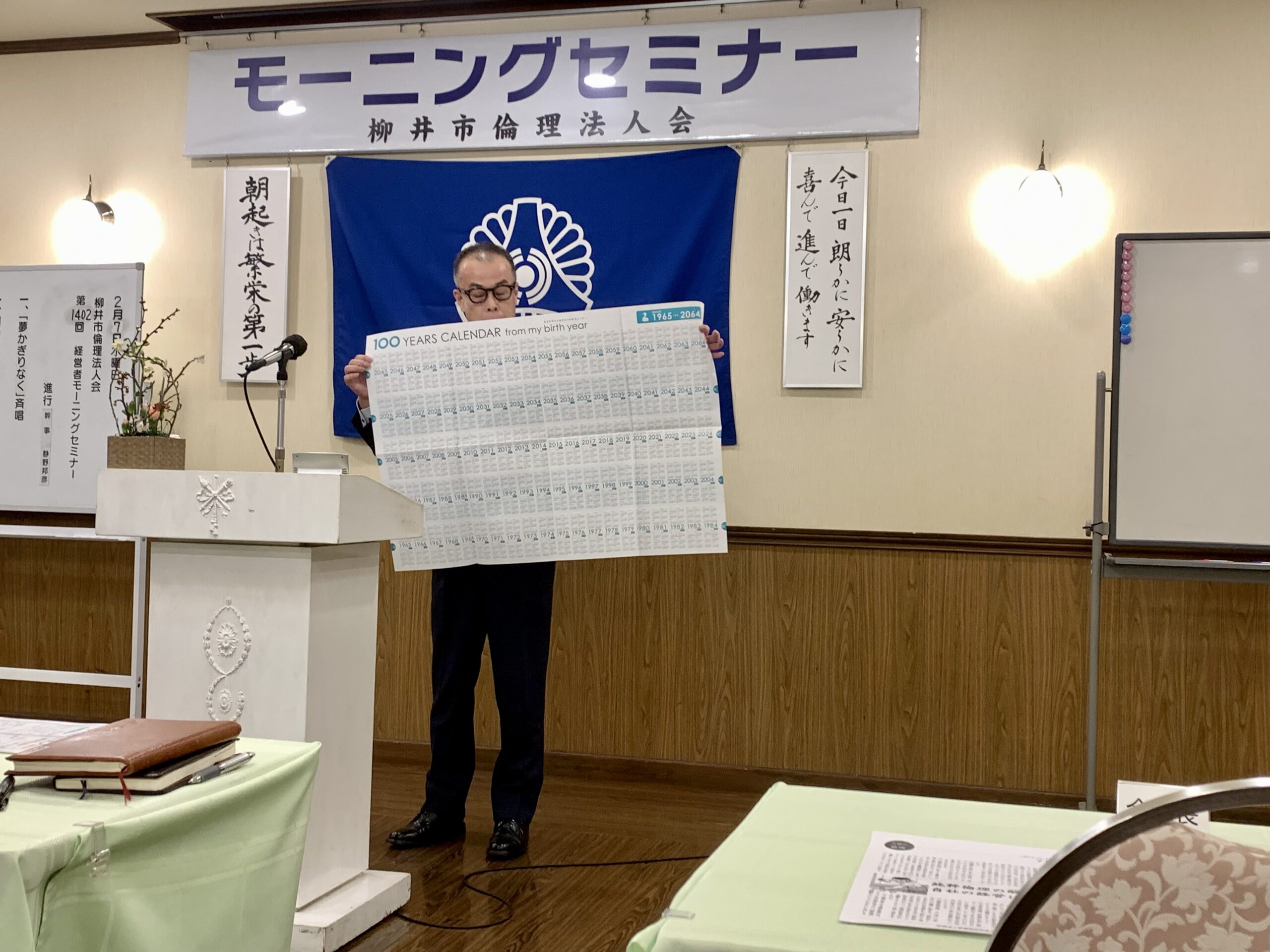 「時を形に」ということで100年カレンダーを用いてご自身の人生の振り返りをお話され、カレンダーを通してみると残りの人生が見えてくるので日々を大切に送ることの重要性をお話されました。また統計による幸福度の高い低いの年齢、人生で一番楽しい年代などのお話もいただきました。