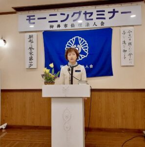 前夜の講演会では事業体験報告を務められた宮﨑様、ご自身の単会の倫友から受けた家族に関するちょっと過激な体験談をお話され、倫理指導で受けた指導内容は「素直に実践する」ことの大切さを強調されました。