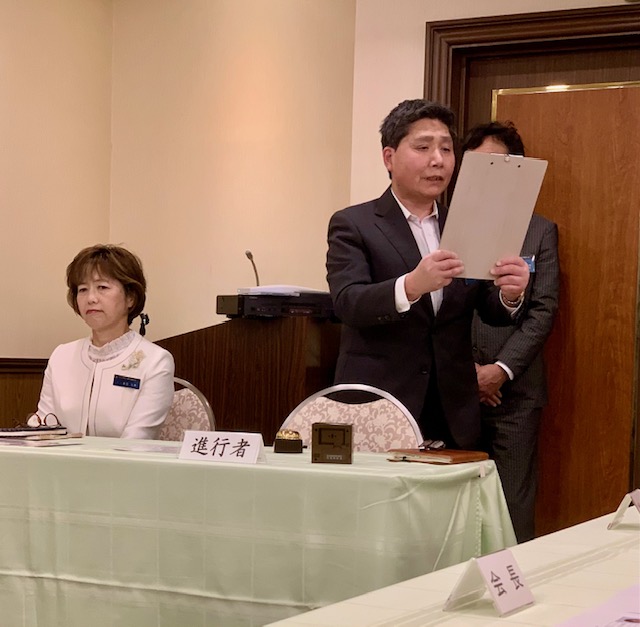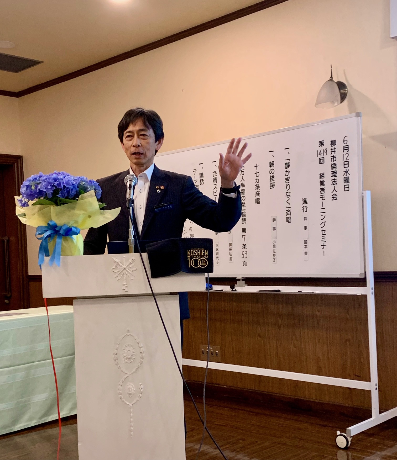 会社の代表になって31年となる九内委員長、「創業92年どん底からの100年企業へのチャレンジ」と題し、事業承継されてから数々の挑戦をするも失敗ばかりでどん底へ。幽霊会員であった倫理法人会のモーニングセミナーに参加し学ぶことで苦難の原因は自身にあることに気づき数々の実践を取り入れ事業が好転されたお話しをされました。