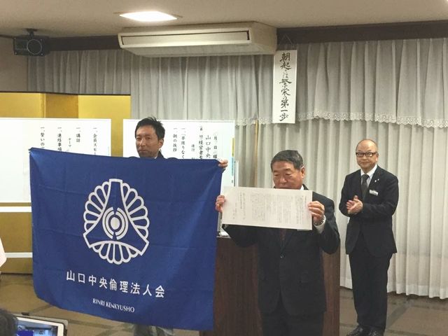 会の冒頭では、この度変更となった単会名「山口中央倫理法人会」の行動旗が法人局より届いたことから