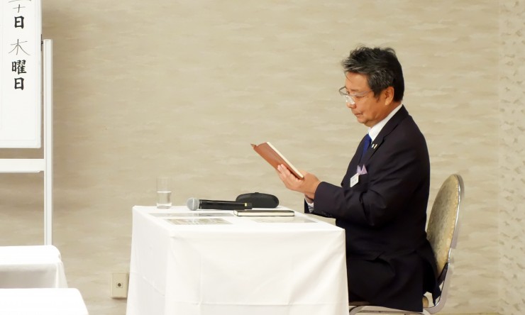原田県会長として最後の講話となりました。 防府版の万歳三唱『お笑い三笑』から講話スタートです。