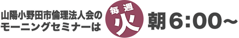 | 朝食 | 朝食をご希望の方は事務局までお申し出ください。※朝食代金は別途必要です。 ※現在、コロナ禍のため地域によって朝食会を中止する場合がございます。お申し込みの際には、各単位法人会から送付しております「経営者モーニングセミナーのご案内」をご確認いただくか、山口県倫理法人会事務局へご確認ください。 |