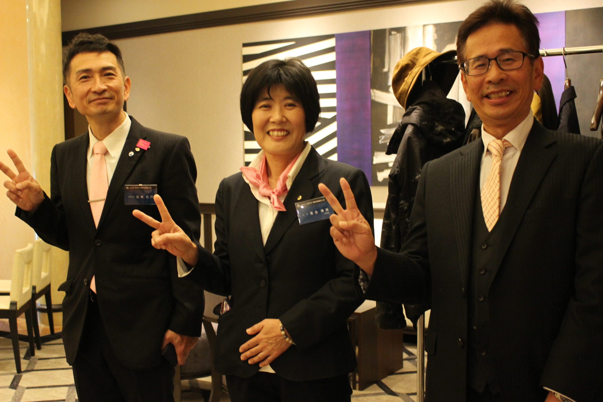 会場入口で笑顔でお出迎えする広森広行副専任幹事・落合博美幹事・野村進一会員
