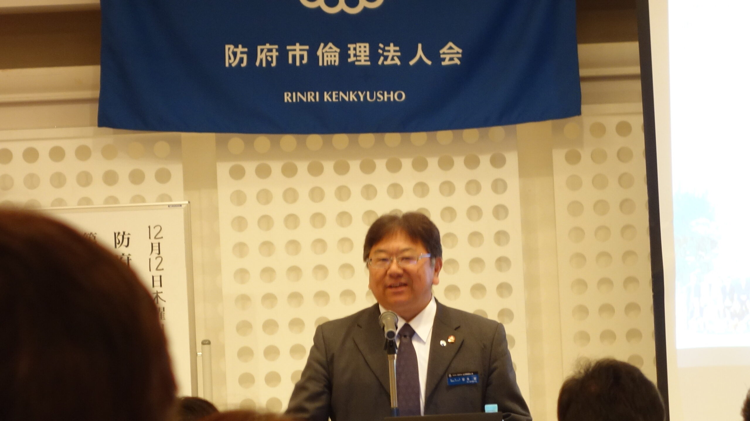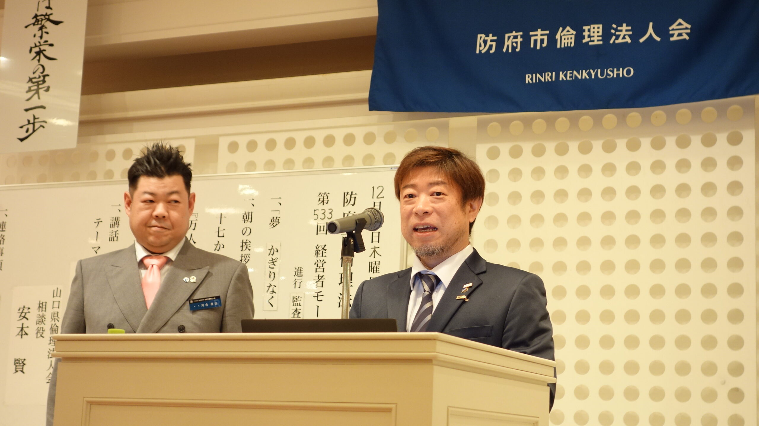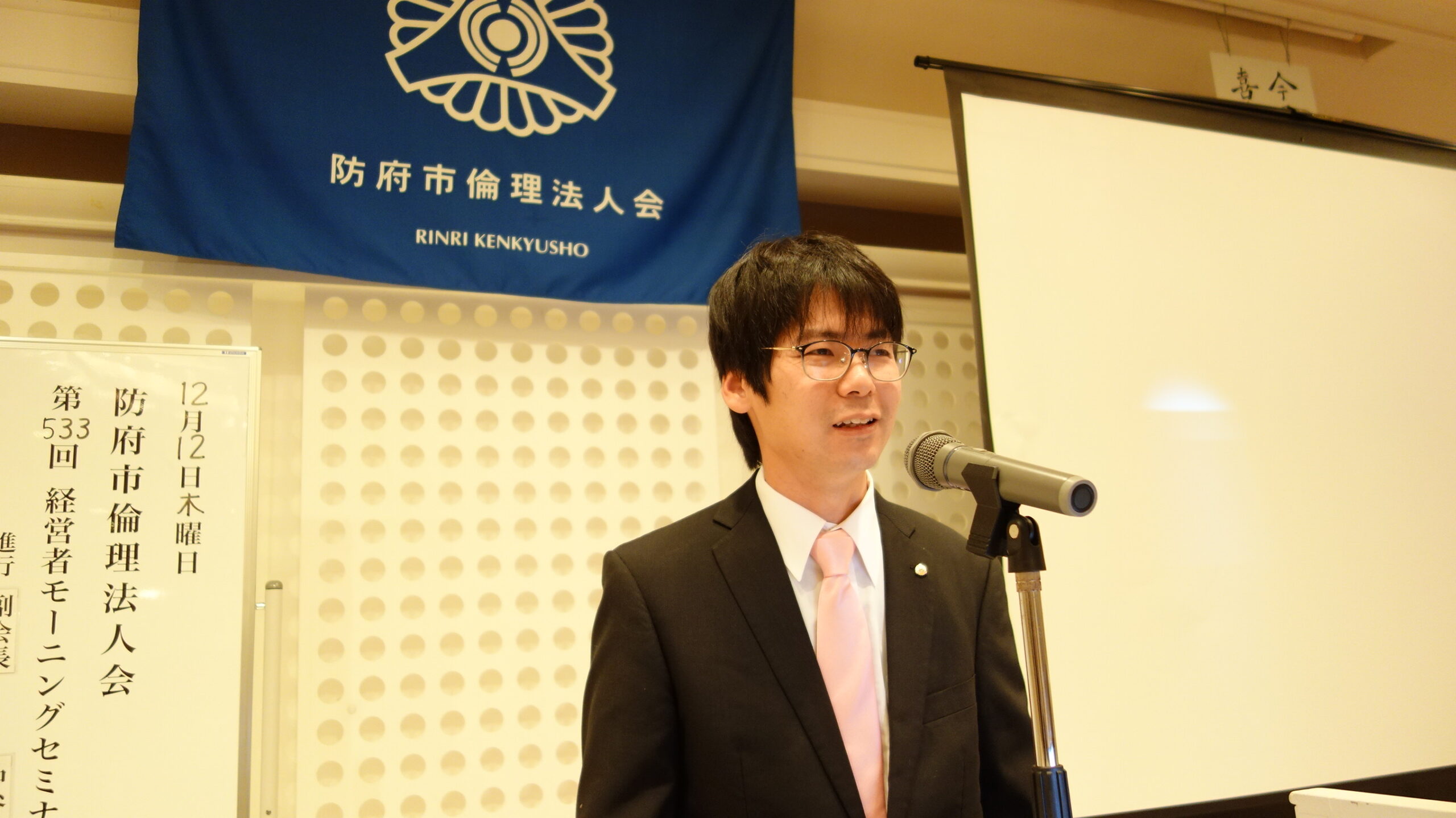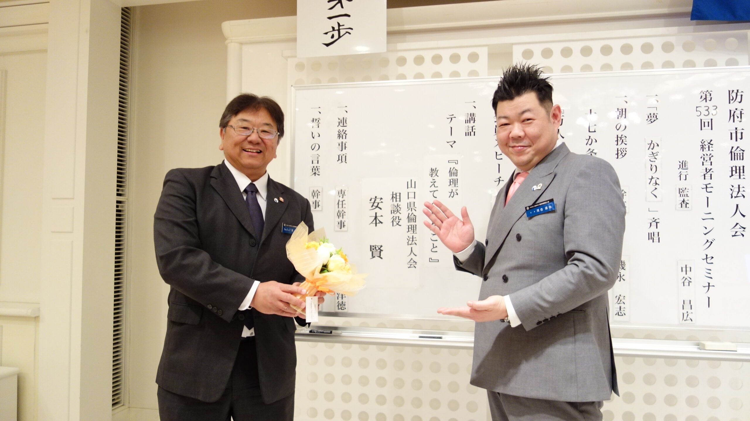 お父様が経営されている会社を立て直す為に東京から山口へ、会社を継がれ奮闘される日々の中、倫理と出会い学びに従い活力朝礼を取り入れるも最初の頃は幹部従業員が次々に辞めてしまったり、反対意見が多かったが根気強く続けていくうちに素敵なご縁に恵まれたり徐々に好転していったお話や人を変えようとせず、自ら改め相手の話を聞く傾聴の実践を続けていたら感謝と幸せを実感できるようになった。自身の心を切り替えさせてくれるのがモーニングセミナー、毎週参加することが大事と熱弁されました。