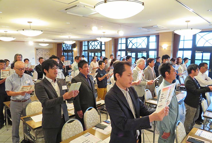 平成30年度締めくくりとして、松永秀夫会長が登壇。 3年の任期間中の出来事を振り返りつつ、モーニングセミナーの活性化や、普及の取り組みについて数々の実践報告(実績)を披露されました。3年間、応援いただき、支えていただき、ありがとうございました、と感謝の言葉で締めくくられました。