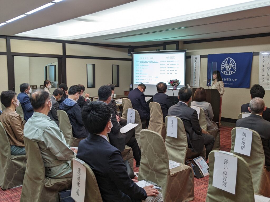 2022年11月8日(火) 第775回MS 講師:三原市準倫理法人会 会長 平岡 佑紗 氏 テーマ:9代目会長 バトンを受け継ぐ者として