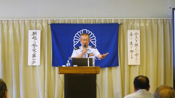 さて、今年になってほぼ毎日のように北朝鮮からのミサイルについて報道され、正にタイムリーな講話を聴くことが出来ました。秋本康雄氏は、山口市嘉川の出身で大学卒業後、甲子園を目指す教師として山口市に赴任されました。そして、3年間の教員生活後航空自衛隊に入隊し、昨年8月より自衛隊山口地方協力本部長として赴任されました。4人の子供さんのうちお二人が自衛官として頑張られているそうです。