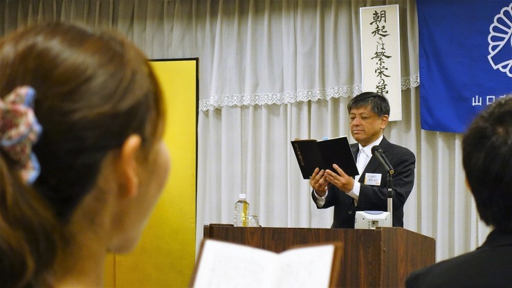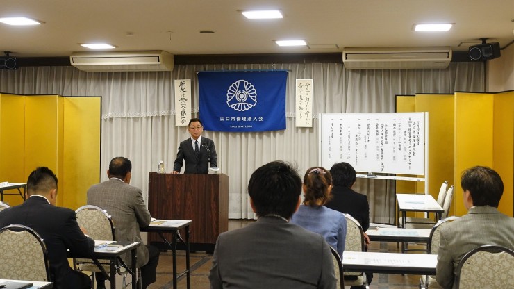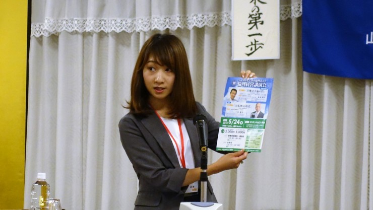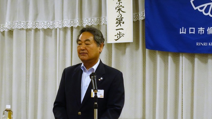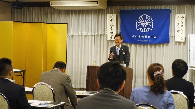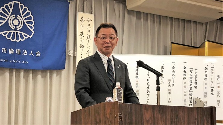 前夜の経営者の集いに続き渡邊恭二徳島県幹事長の講話は、単会会長職3年を通して得た自己革新についてでした。レクチャラーとして巡行した単会の会員さんの悩みごとの話から倫理指導を勧めたところ、すぐに実行した会員さんから後に感謝の手紙をもらったことがあり、即行の大切さを話していただきました。また、仕事の受注量が減少、赤字化する中で受けた会長職。最初の頃、モーニングセミナー参加者5人で寂しい思いをしたそうですが、会員の皆さんに喜んでもらおうという心がけ、幹事全員への倫理指導の勧めなどを行っていくうちに参加者が30人を超えるようになり、事業も黒字になったそうです。9月からは、奥様が単会会長を務められることになっていて、夫婦愛和も実行されています。見習いたいこと万歳の講話でした。