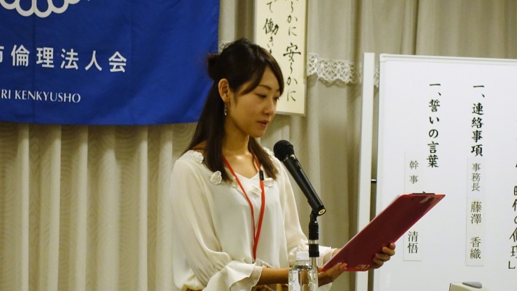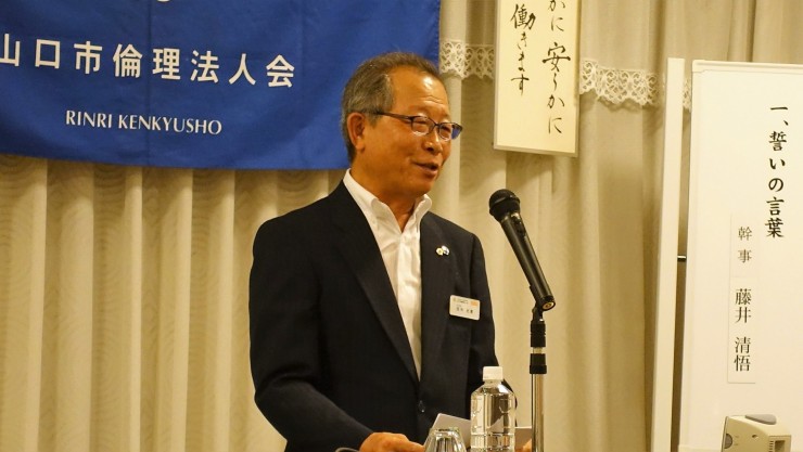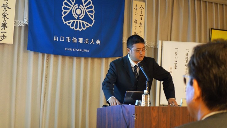 会員スピーチは、田中光憲専任幹事。展示会場設営などに関わる仕事をする傍ら、今後の生き方について倫理の実践をモーニングセミナーから学んでいきたいと誓われました。