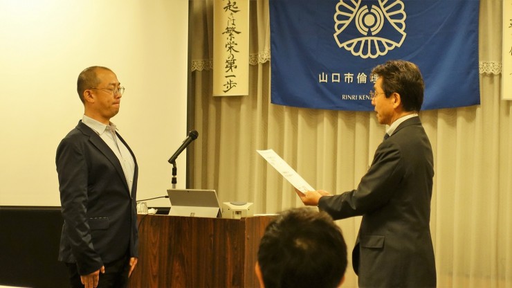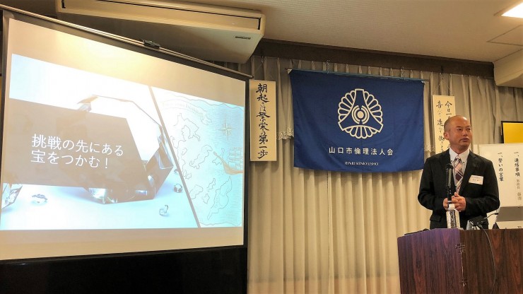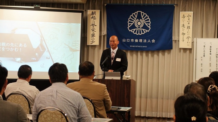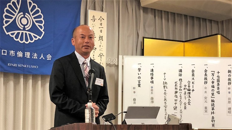 続いて、いちごやけんちゃんでお馴染みの田中健一山口中央普及拡大委員長による講話でした。「苦難から逃げない!自分に投資!」との語りには説得力がありました。十代の頃、バイクに熱中し転倒事故で命を落としかけた時に通りすがりに助けてくれたおじさんや入院中に励ましてくれた看護師さんへの感謝を忘れず、自分の進むべき道を決め、まっすぐに苦労しながらも意思を貫き続けている姿に感動しました。観光イチゴ農園、農薬散布用ヘリコプター事業だけでなく、「健康」をテーマに食農保育など多彩なコンテンツを有する新たな事業に意欲を燃やしていて、頼もしく感じました。