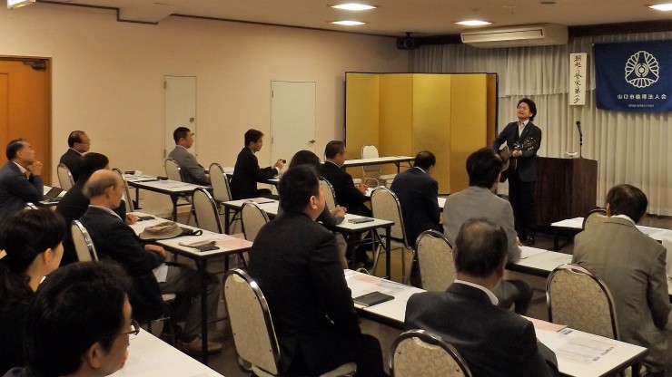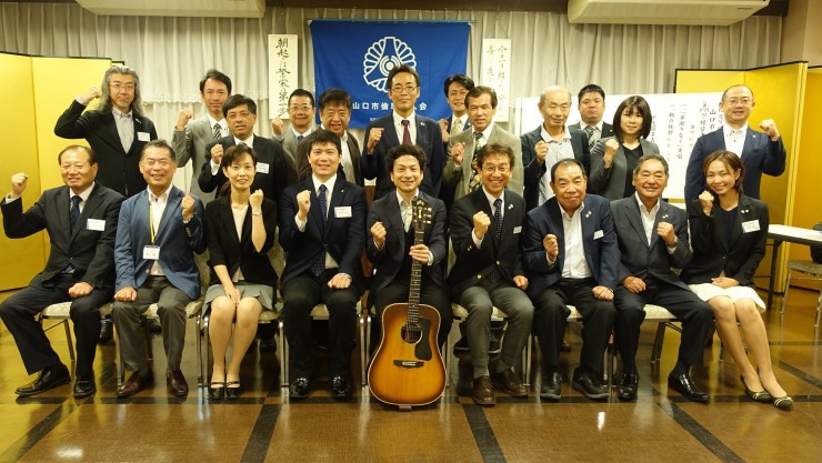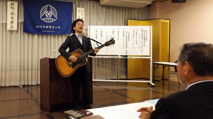 学生時代を山口大学で過ごし、湯田は第二の故郷と語るシンガーソングライターの池端克章氏の講話でした。山口県倫理法人会のホームページで、山口市のモーニングセミナーに学生時代お世話になった海鮮長州の河内山さんを見つけてすぐに電話をかけ、8月7日の山口市のモーニングセミナーに出席。事前に聞いていたので会員スピーチをお願いしました。大学2年生で友人とギターを片手に始めた音楽活動。ホテル松政前の歩道で路上ライブしていたことをきっかけにケーブルテレビなどに出演、その後プロミュージシャンを目指すことになり、内定を断ったことで進路についてご両親と確執が生まれ、家を飛び出したそうです。