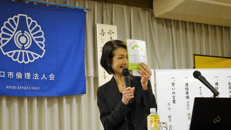 ユニバーサルデザインとは、「特殊な設計や調整をすることなく、できる限り多くの人が利用できるように製品やサービス・生活環境をデザインする」という考え方であると具体例交えて話していただきました。デザイン対象を障害者に限定していない点が「バリアフリー」とは異なっていることや、福岡市や九州国立博物館の取り組み例についてわかりやすく説明していただき、多くの人にユニバーサルデザインについて理解してもらいたいと笑顔での説明が印象的でした。