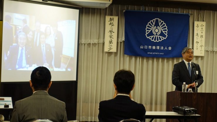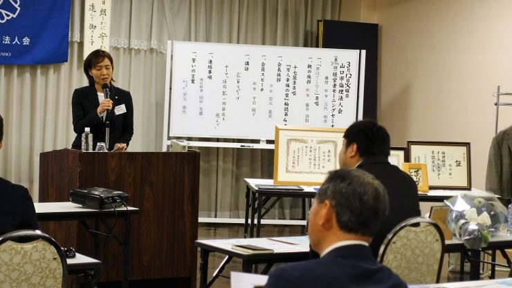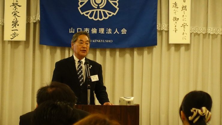 山下鐵洋相談役: 20年前8月8日山口市に倫理法人会設立時に、ある人から「あんた一人じゃダメよ。」と言われ、垣内さんに相談するとすぐ入会して協力してもらった。有り難い事として、自社の危機(社員の退職)の時に倫理指導を受け、息子を社長にと言われたが納得出来ず、垣内さんに相談。「働き過ぎだよ」と言われたことで事業を継承し 危機を乗り切れた。感謝!