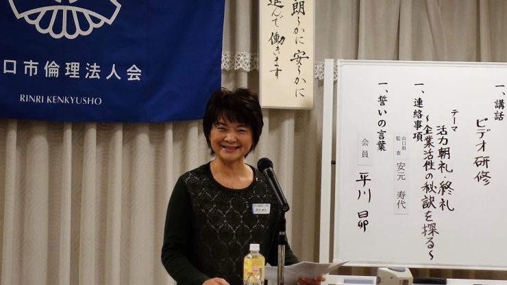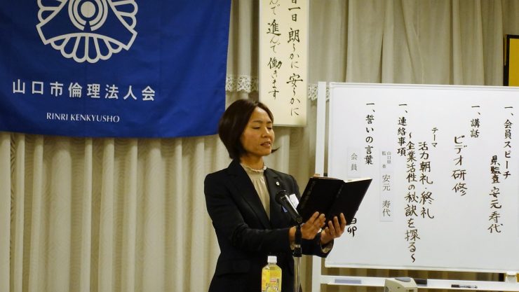 会員スピーチ:安元寿代県監査が、「倫理法人会に入会して感じていること」についてのスピーチでした。子どもの入学式・卒業式、またその他の会に参加して先生や保護者・来賓の方など呼ばれた時に黙って席を立たれることに違和感を思えるようになり、倫理法人会の方たちは「ハイっ!」と元気に返事をして立たれることに素晴らしさを感じています。