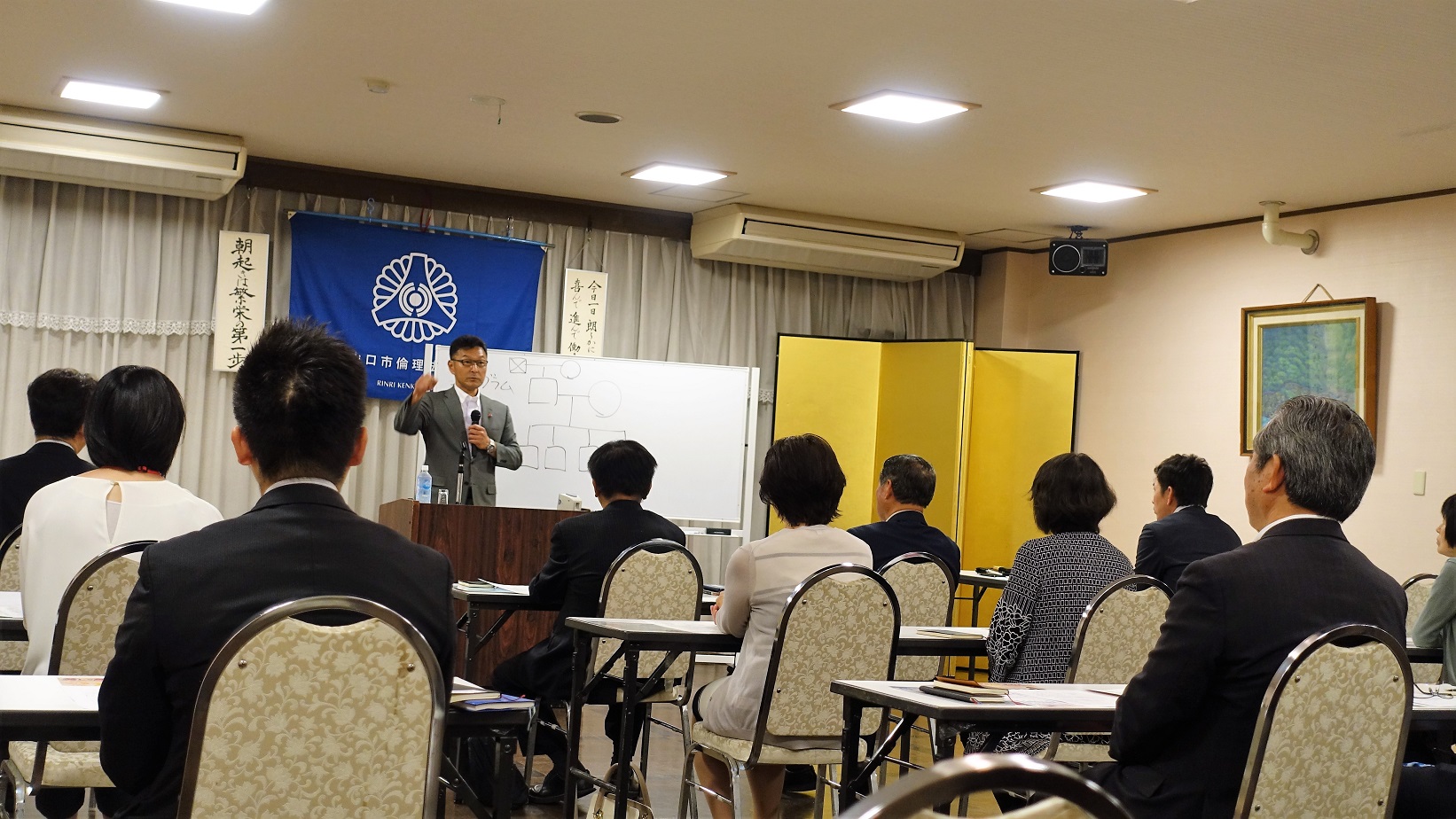 里親として児童福祉に取り組まれている山口市市議会 坂井芳浩議長に講話をしていただきました。モーニングセミナーの時間は、自宅から4㎞走ったところで(帰りもランニング!)通学時の立哨を続けられているそうで、それだけでも素晴らしいと思いますが、さらに児童福祉に力を注がれています。児童福祉に取り組むきっかけになった話、これまで3人の里親として預かられた経験、奥様や4人の子どもさんと預かった子どもさんとの関わりについての話に感動するとともに歪んだ社会の是正と社会を明るくする取り組みが重要であることを実感しました。
