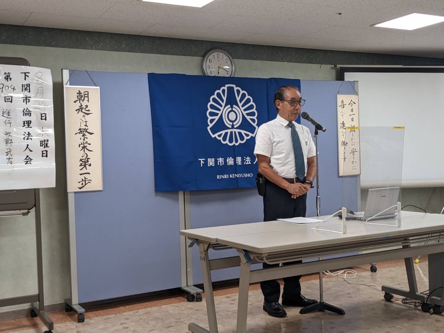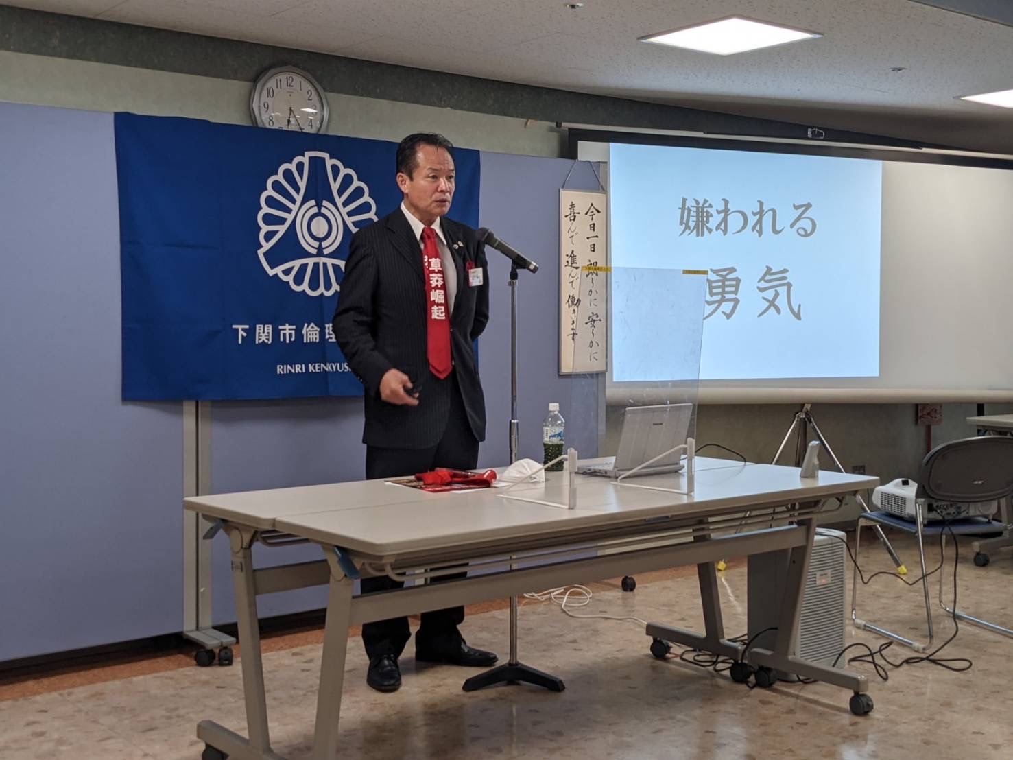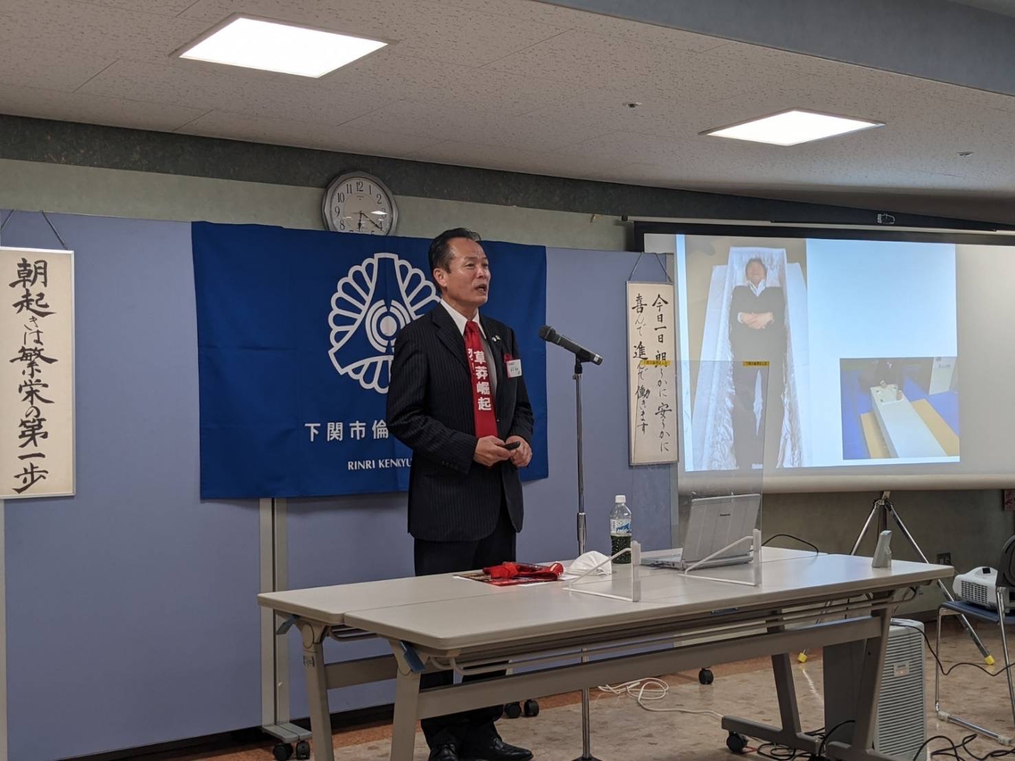萩市倫理法人会 会長 / 株式会社エリナ山口 代表 / 株式会社 日本健康経営 顧問 金子 聖司氏をお迎えし、「人々の心の鐘を鳴らし続ける理由(わけ)」についての講話を拝聴しました。