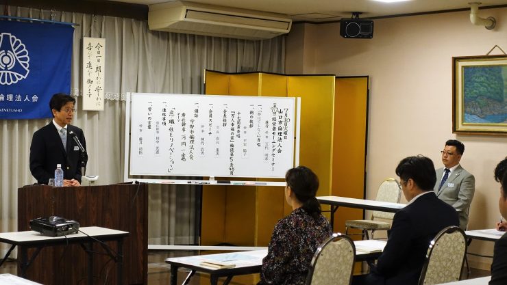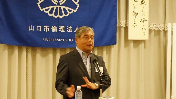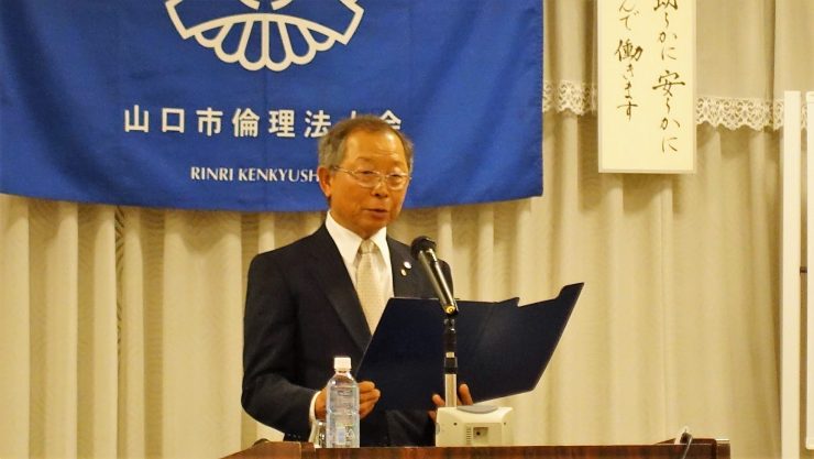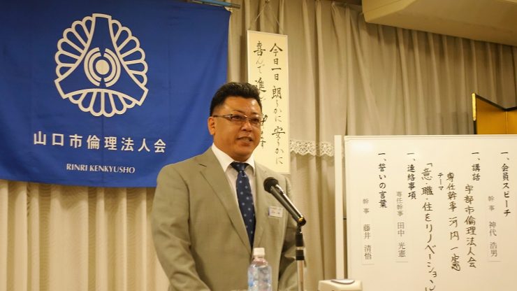 講話は、宇部市倫理法人会の河内一憲専任幹事でした。今年5月の富士研に行く前に事業上の難題が生じ、参加を見合わせようか悩んだ上、出発前夜に参加を決断。研修3日目の電話で難題が解決したと聞き、講話をお願いしました。