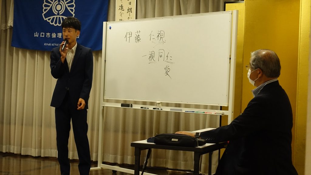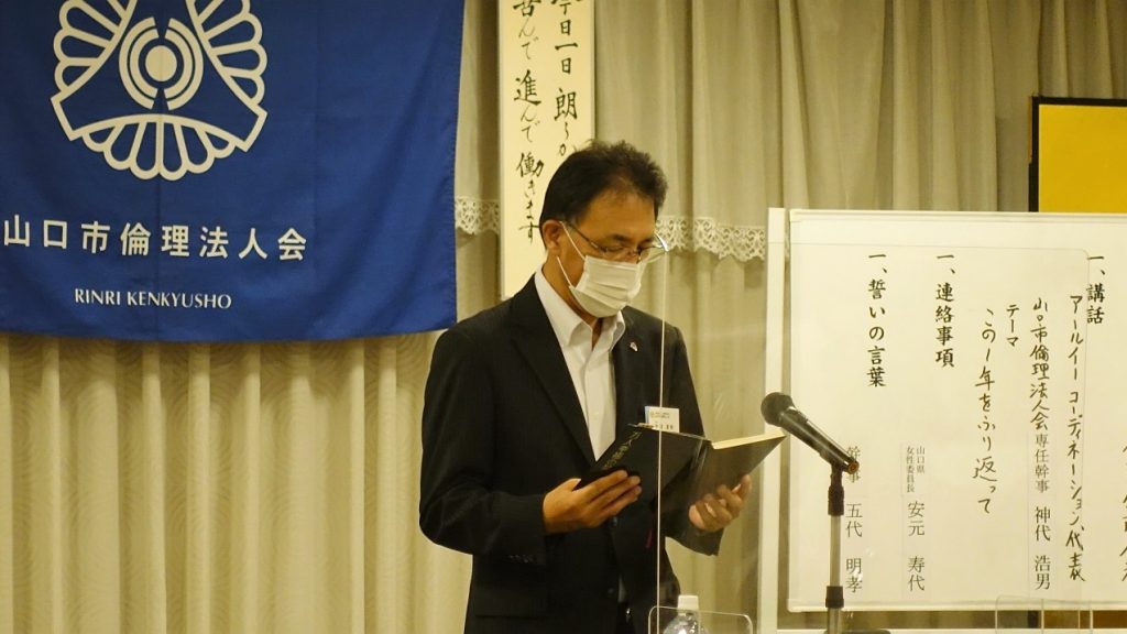 講話:神代浩男専任幹事: 1年間の専任幹事の仕事を通して「役を全うすることの大切さ」を学ぶことが出来た事。停車中に追突されたりクレジットカードの不正利用されたりするなど、自分に降りかかってくる事象を倫理の学びに当てはめ対処出来るようになってきたと、これまでと違った内容の講話でした。