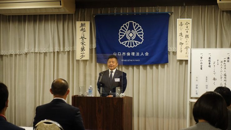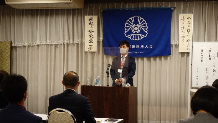 講話: 前夜の倫理経営基礎講座に続き、高木正江法人スーパーバイザーの講話でした。最初は義理で入会したが、仕事に行き詰った時に万人幸福の栞から気づいたことや先輩からのアドバイスを通して苦境を乗り切り、次第に受けていった役割を果たすうちに「明朗」であることの大切さを知ることが出来たとのお話でした。ふんわりと温かさを感じながらも、綿密に物事を成し遂げる秘訣を聴け、充実した話を聴かせていただきました。