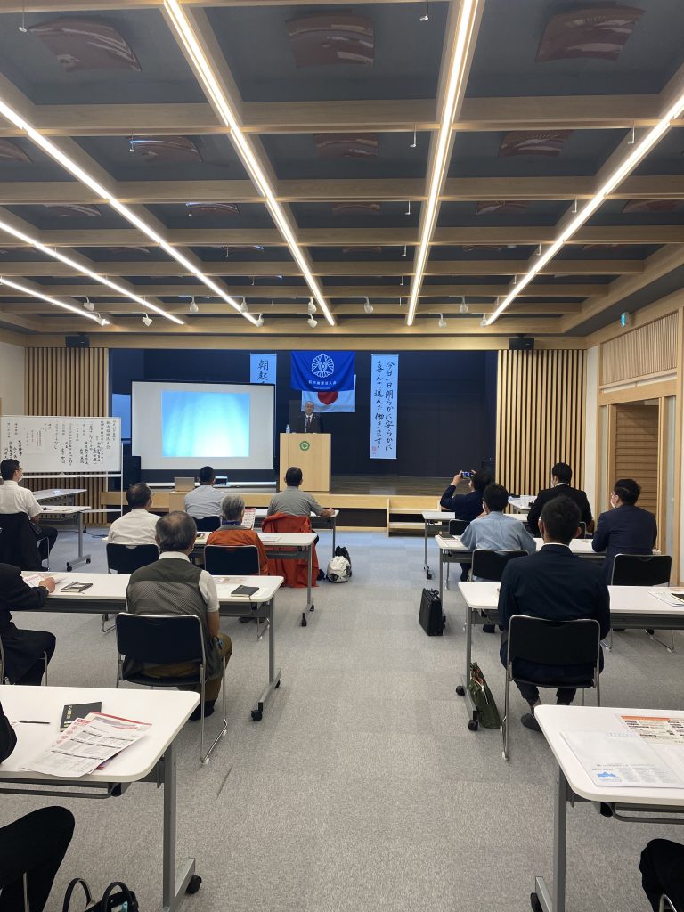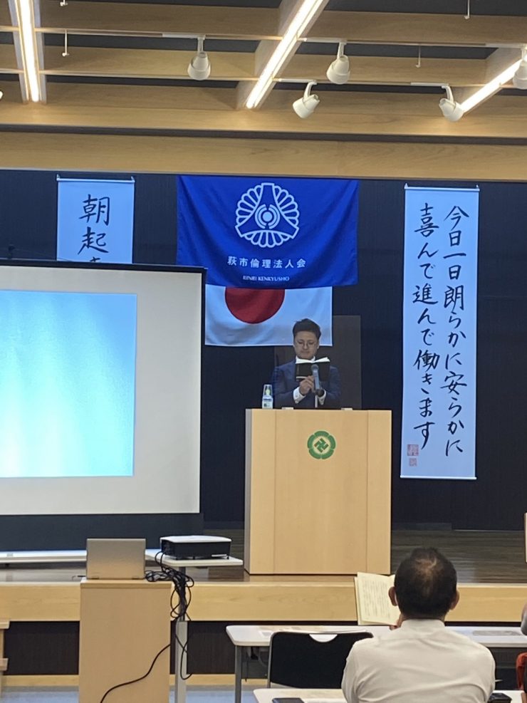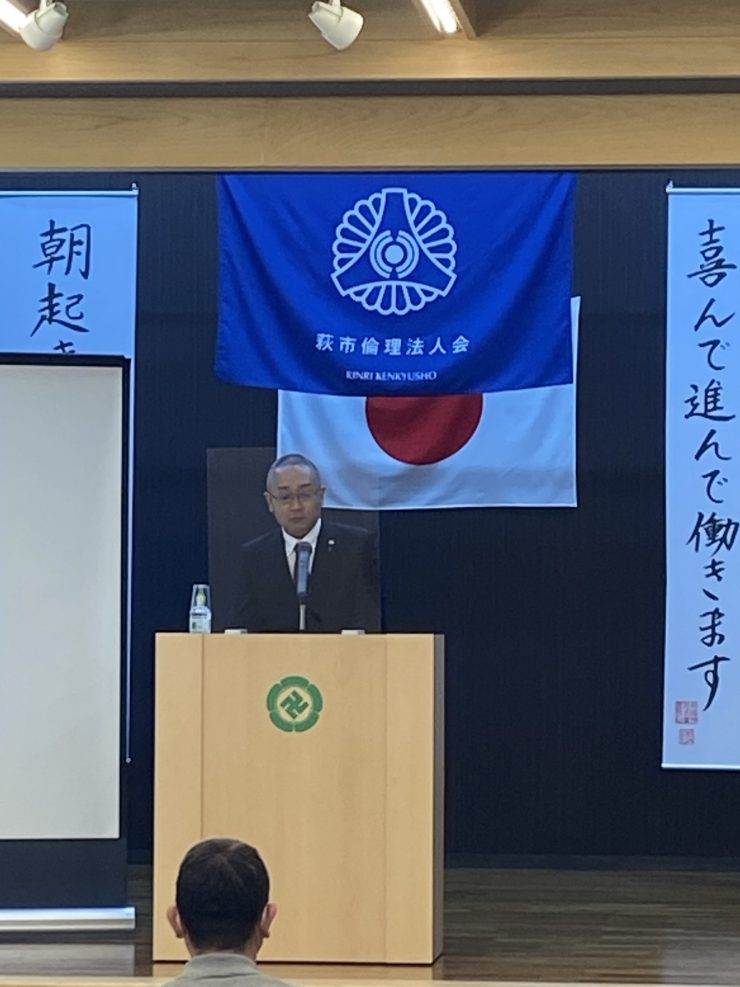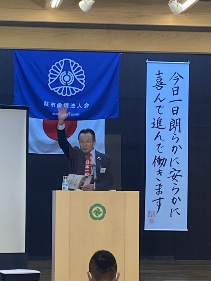 萩市倫理法人会MS、第99回。 講師は、飯山八幡宮 宮司 の 上田久充氏でした。