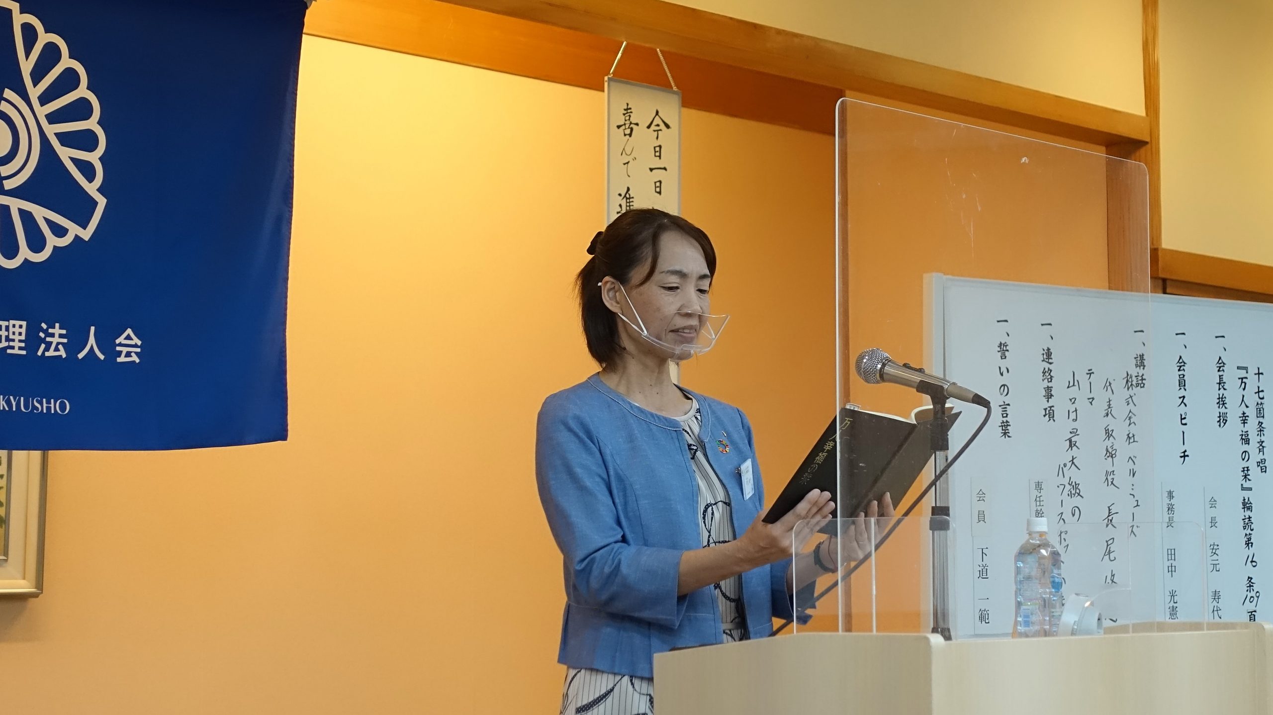 朝の挨拶:平岩陽子県朝礼委員長:第十六条「尊己及人」