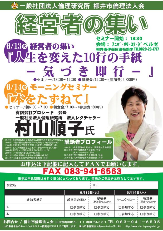 経営者の集い  講師:(一社)倫理研究所 村山 順子 法人レクチャラー テーマ:「人生を変えた10行の手紙 -気づき即行-」
