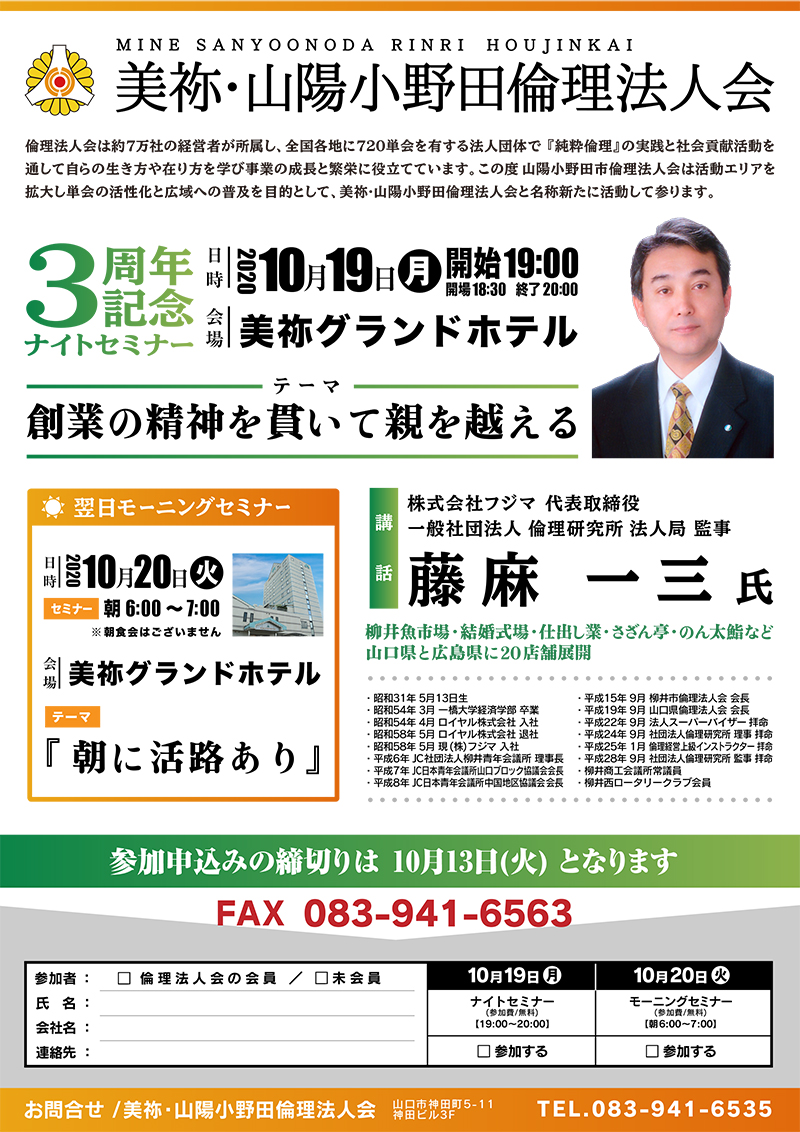 美祢・山陽小野田倫理法人会 3周年記念ナイトセミナー『創業の精神を貫いて親を越える』 講話:株式会社フジマ 代表取締役 / (一社)倫理研究所 法人局 監事 藤麻 一三 氏