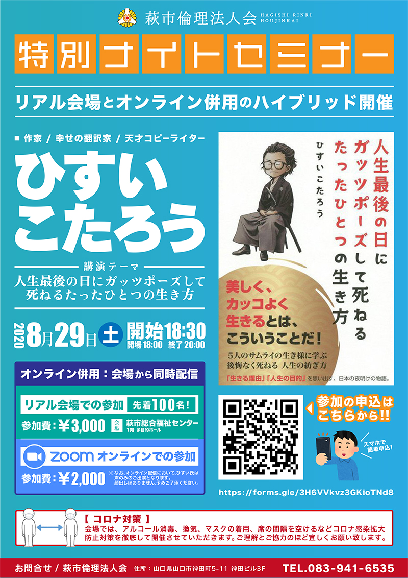 | 講話 | 作家 / 幸せの翻訳家 / 天才コピーライター ひすい こたろう 氏 |
