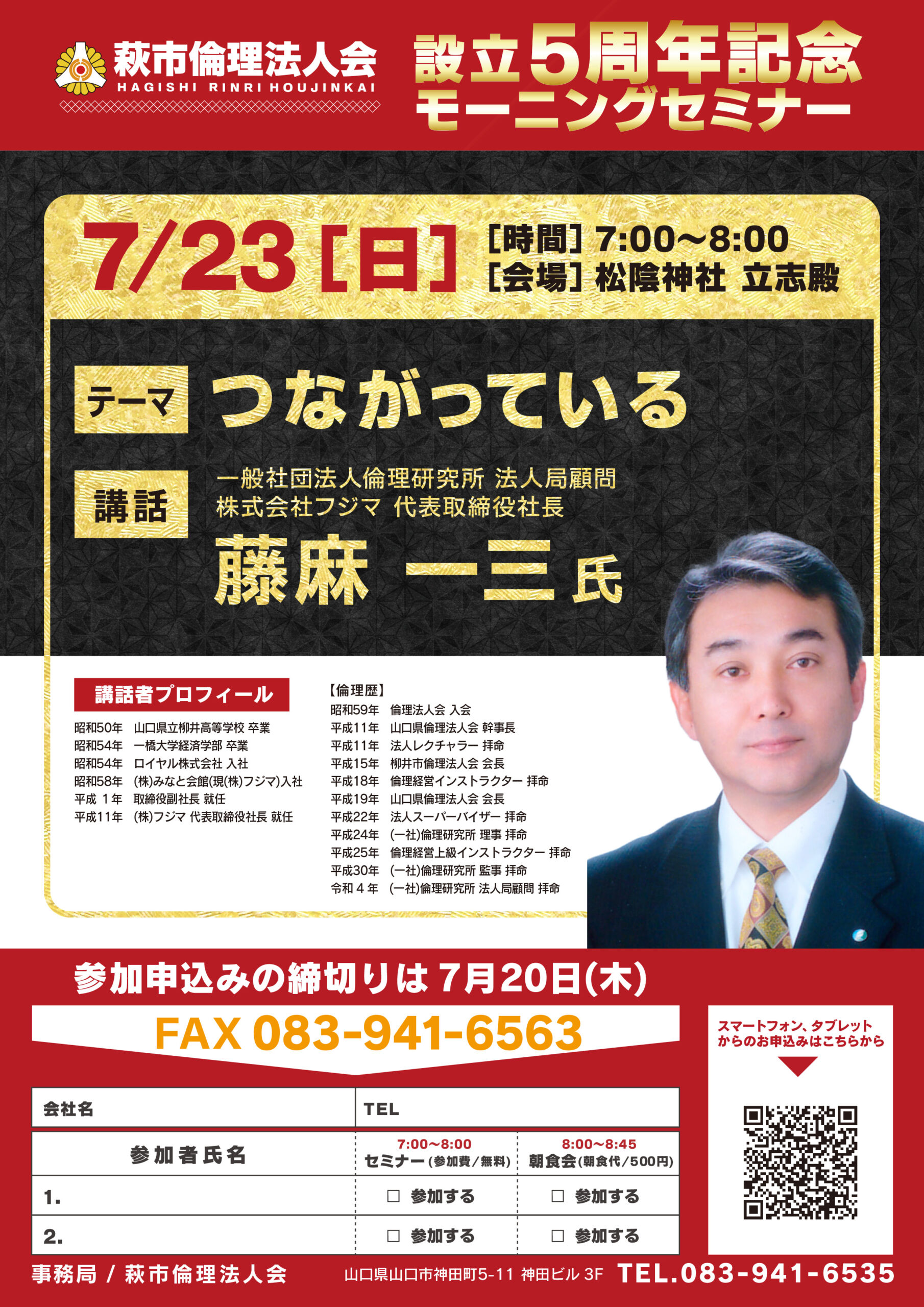 萩市倫理法人会 設立5周年記念 モーニングセミナー 講話一般社団法人倫理研究所 法人局顧問 株式会社フジマ 代表取締役社長 藤麻 一三氏 テーマ つながっている 日時 2023年7月23日(日)セミナー 7:00~8:00 朝食会 8:00~8:45 会場 松陰神社 立志殿